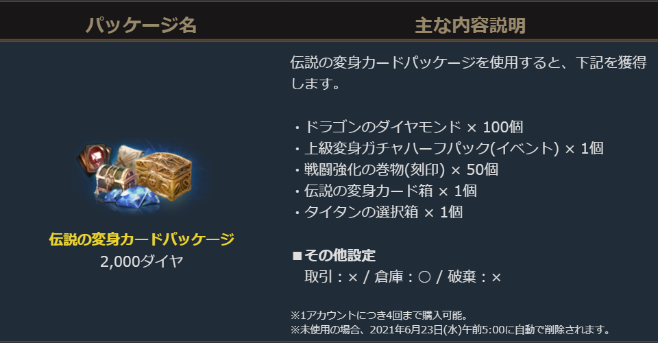 伝説級の変身が狙える、変身カードの取得に便利なパッケージです。
