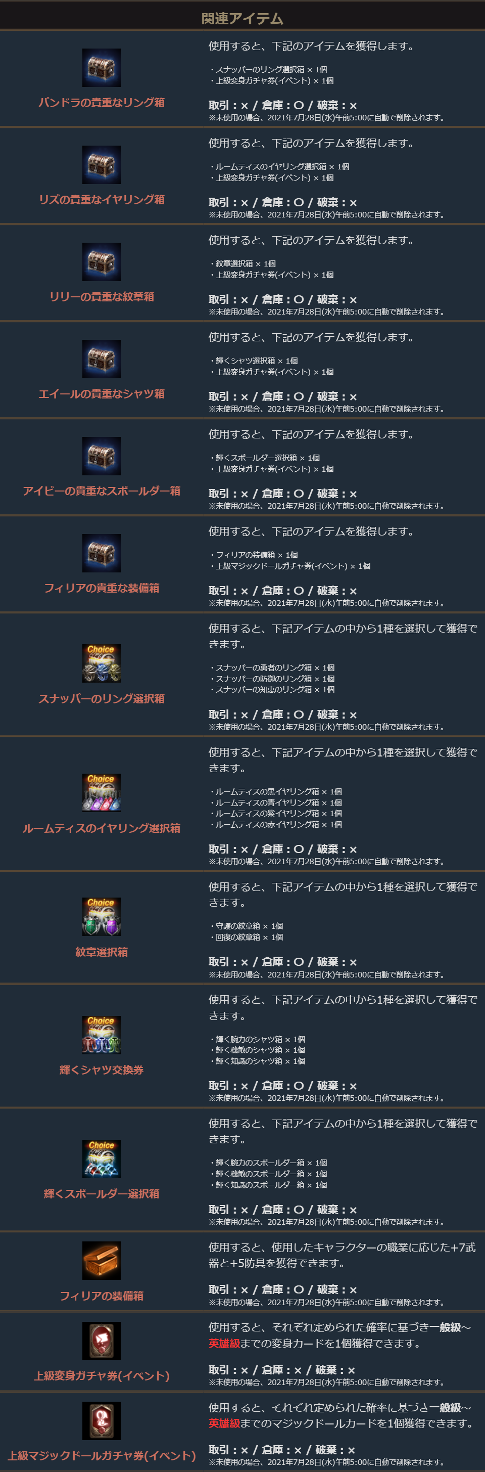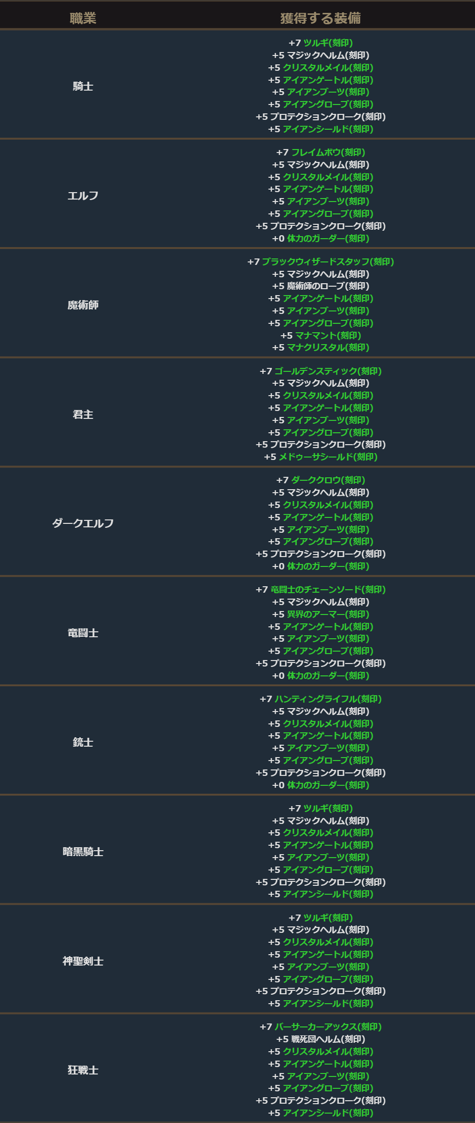 各種フィリアの装備箱から各職業ごとに獲得できる装備は以下となります。