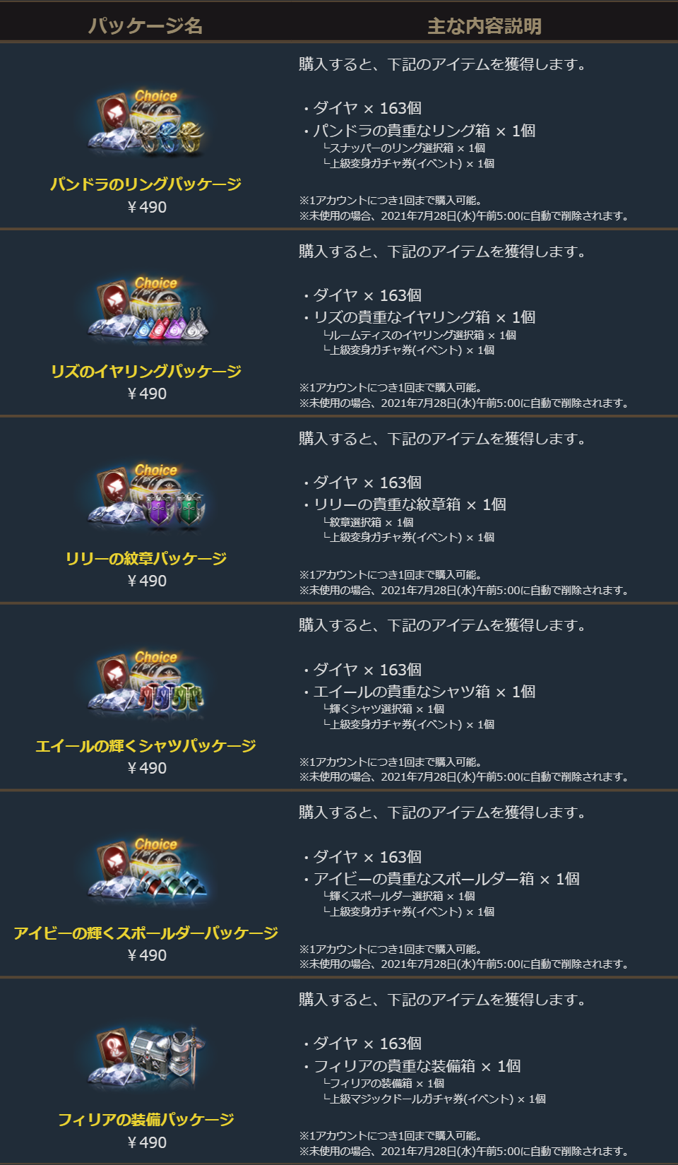 それぞれワンコインでダイヤと装備が入手できるお手ごろなパッケージです。