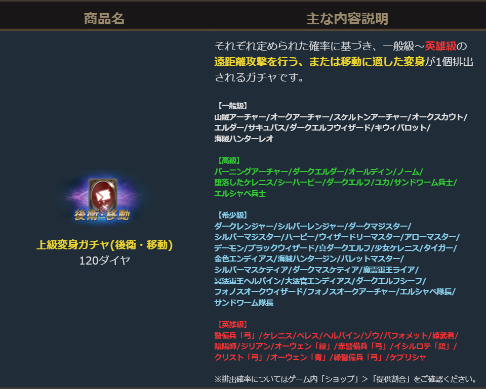 ■ピックアップ上級変身ガチャ(後衛・移動)