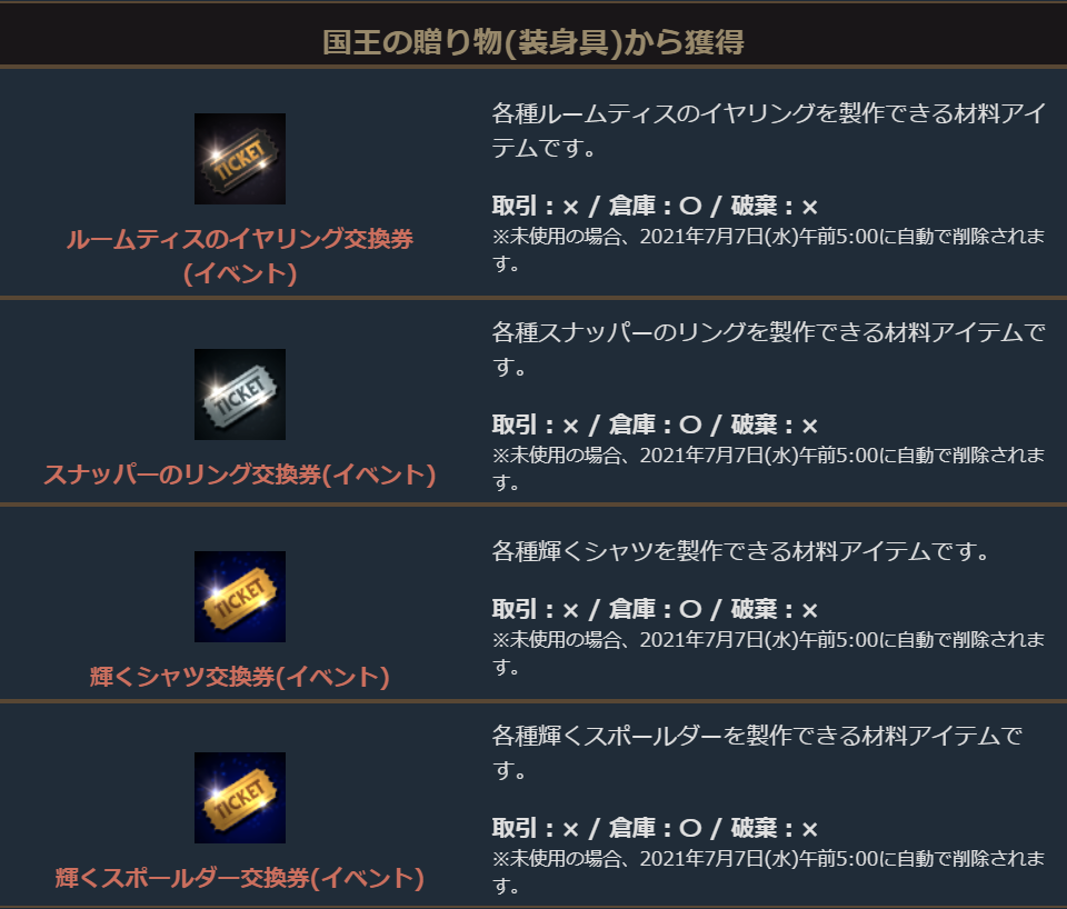 国王の狩猟場では、ドラゴンの聖水や希少級製作秘法書のほか、ルームティスのイヤリングやスナッパーのリング、輝くシャツ、輝くスポールダーの装身具交換券がランダムに手に入る「国王の贈り物(装身具)」がドロップします。