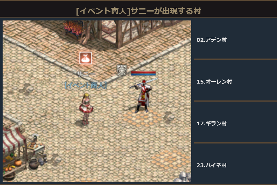 イベント期間中、アデン大陸の各村に[イベント商人]サニーが出現します。