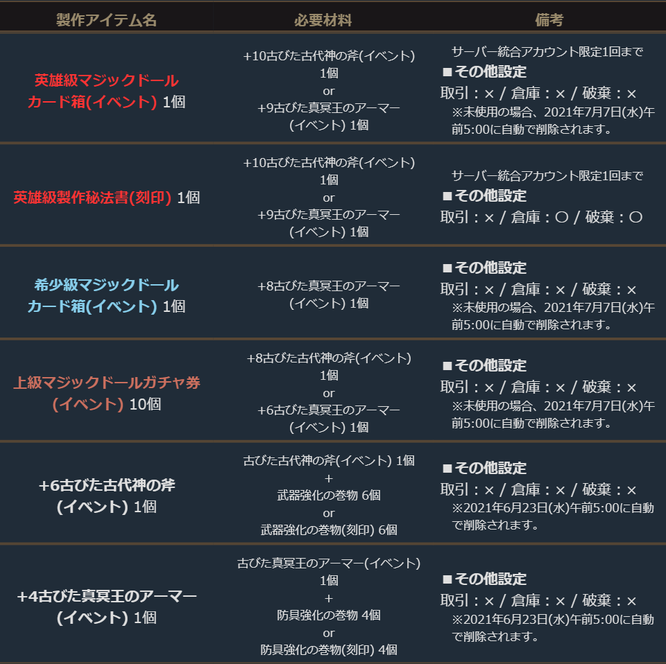 未強化のイベント装備は、強化する場合と同じ数量の強化の巻物を材料にして、安全強化値まで強化されたイベント装備を製作できます。