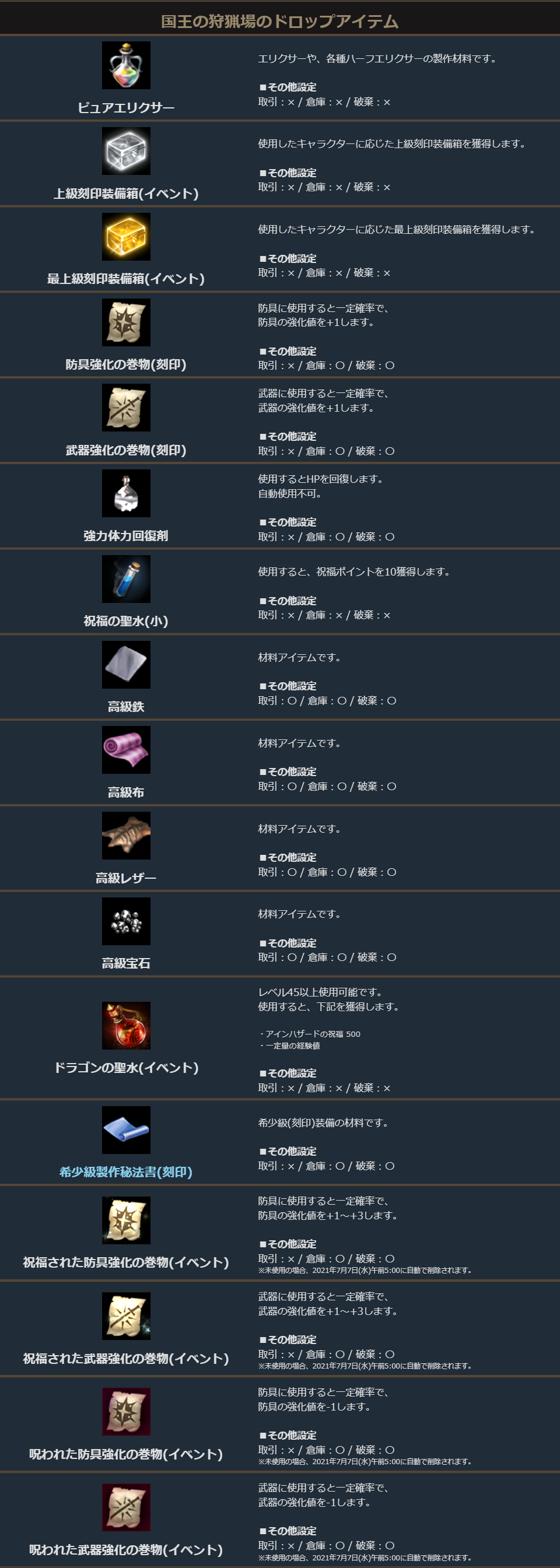 国王の狩猟場では、ドラゴンの聖水や希少級製作秘法書のほか、ピュアエリクサーがドロップします。
