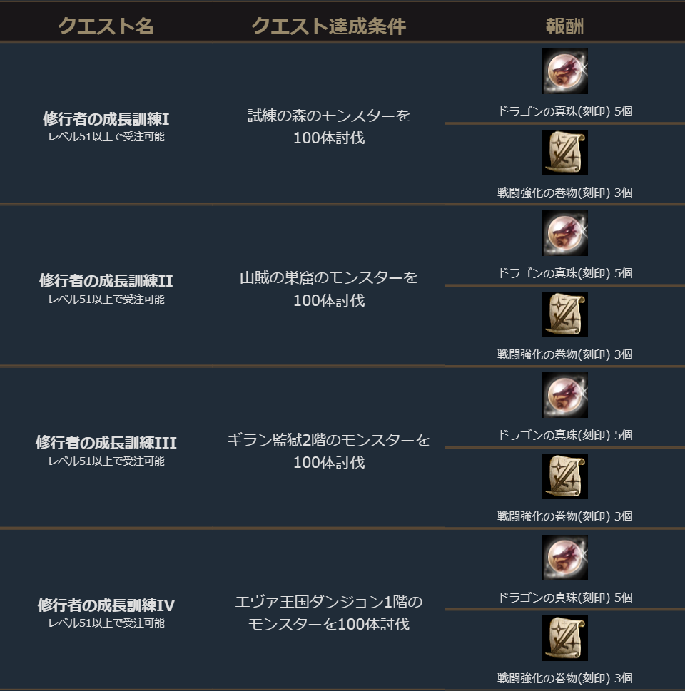 「タイタンの輝く成長パッケージ」に含まれる「修行者の書簡箱」を使用することで入手できる各種「修行者の書簡」で、専用クエストを受注することができます。