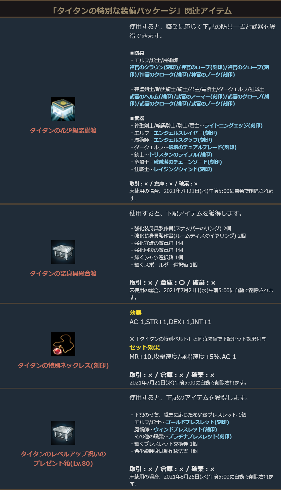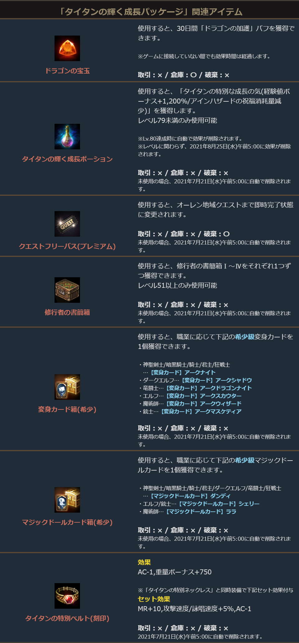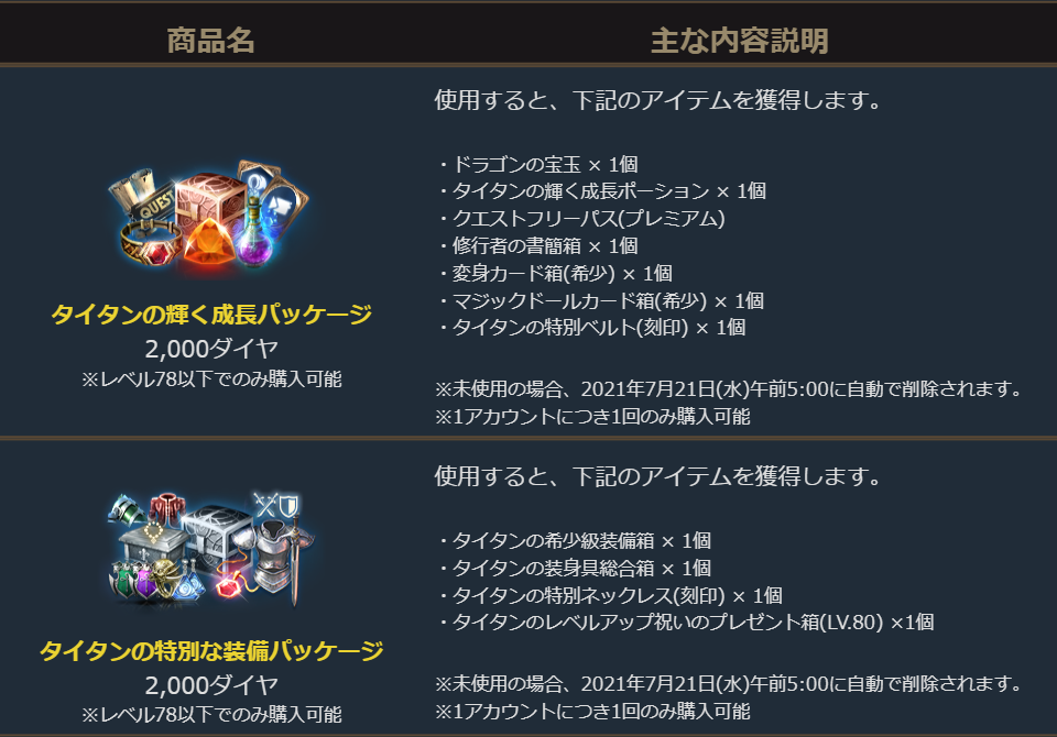 イベント期間中、ゲーム内ショップより「タイタンの輝く成長パッケージ」「タイタンの特別な装備パッケージ」が入手できます。