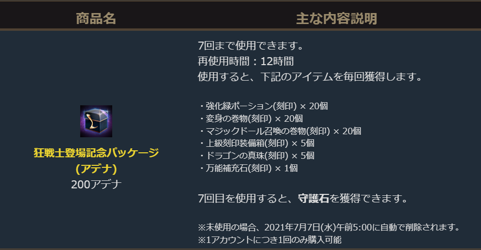 イベント期間中、ゲーム内ショップより「狂戦士登場記念パッケージ(アデナ)」を200アデナで入手できます。