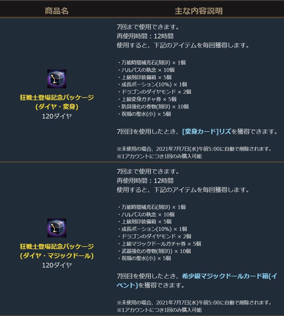 「狂戦士登場記念パッケージ(アデナ)」は12時間おきに1回使用でき、冒険に役立つアイテムが毎回入手できます。