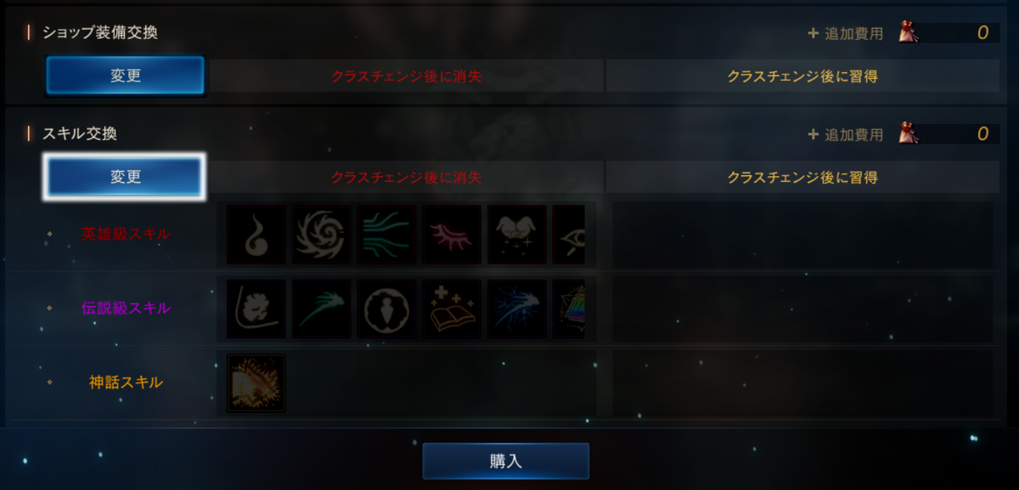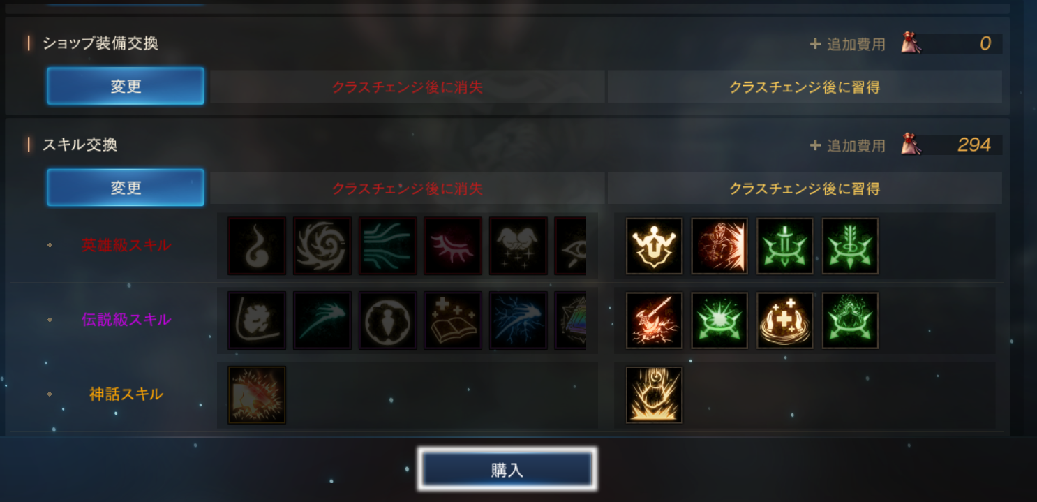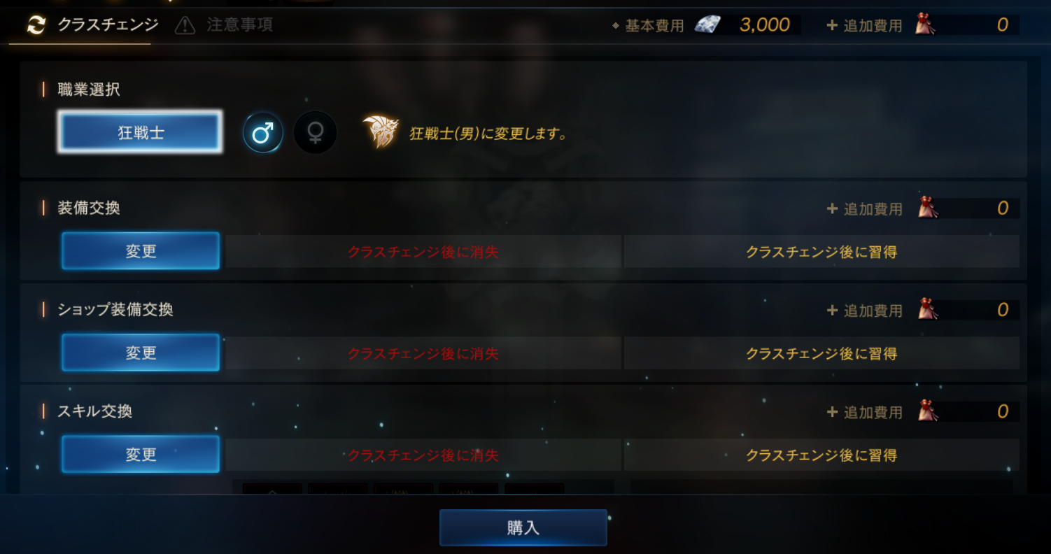 クラスチェンジは、血盟君主と狂戦士を除くレベル75以上の全職業のキャラクターで購入することができます。