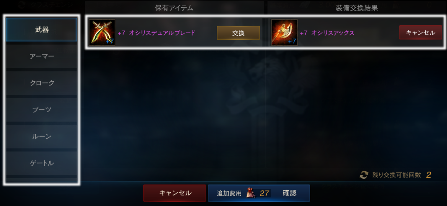 また、クラスチェンジ時に一部特定の装備やスキルを、選択した職業の装備やスキルに追加費用としてギルタスの遺物袋(刻印)を支払うことで交換することができます。