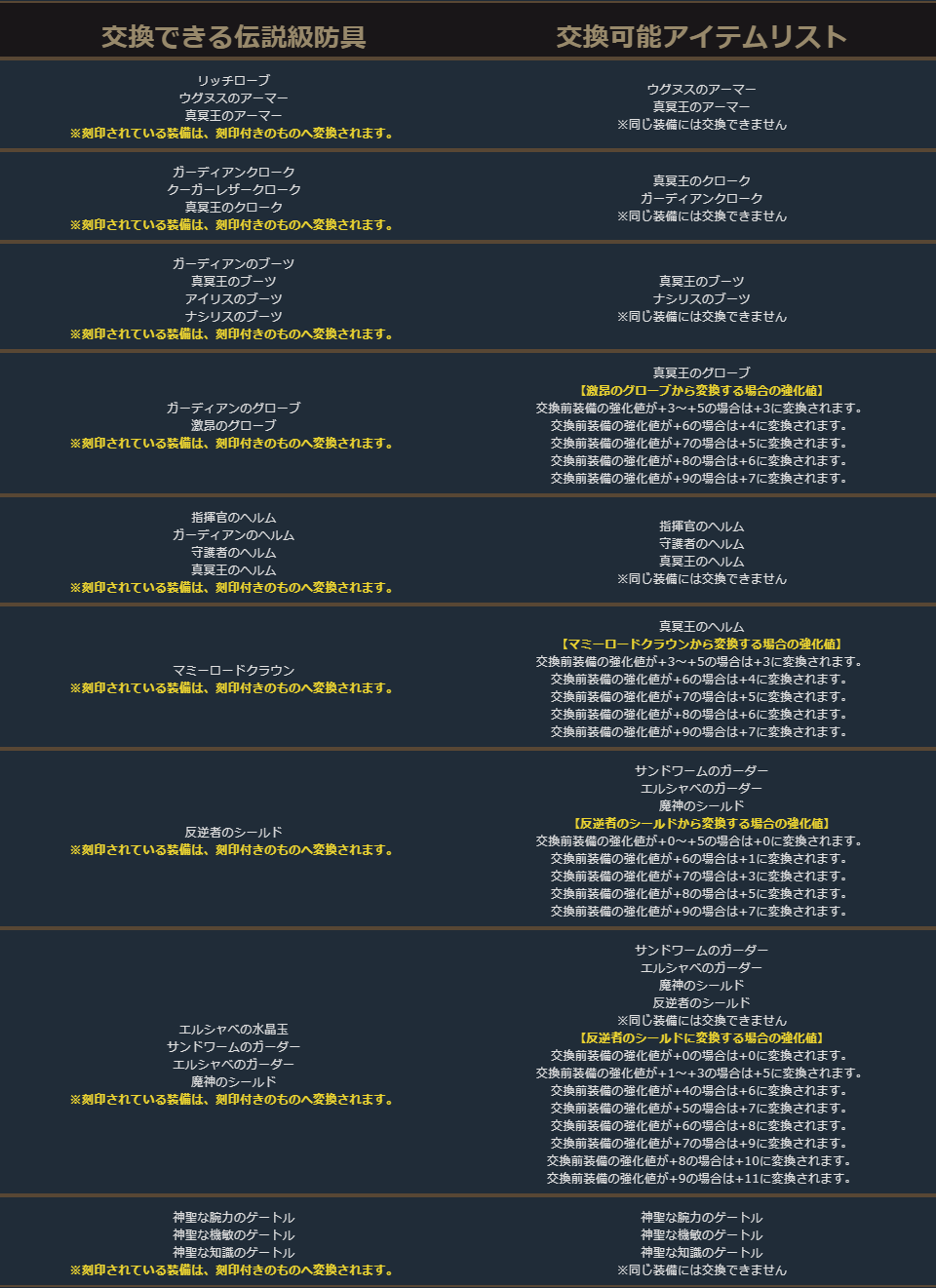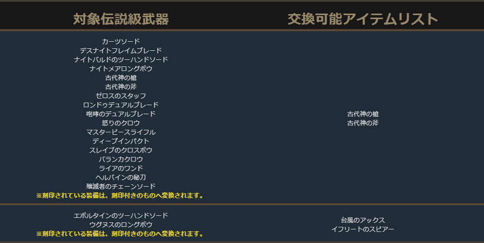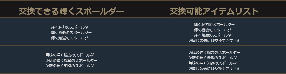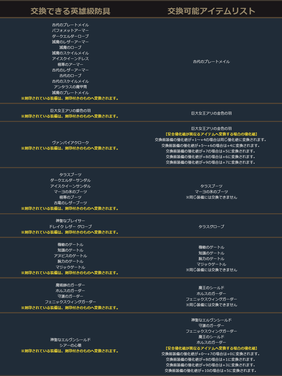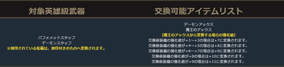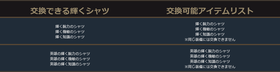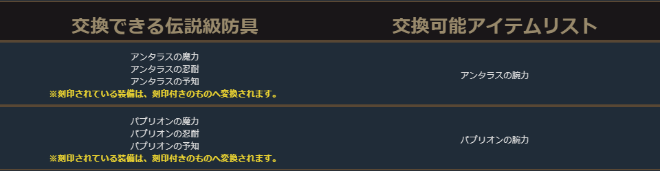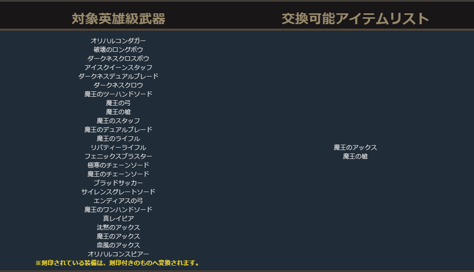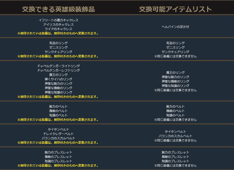 英雄級防具の交換リスト内の一部に本来は交換できないアイテムが含まれておりましたため、削除いたしました。