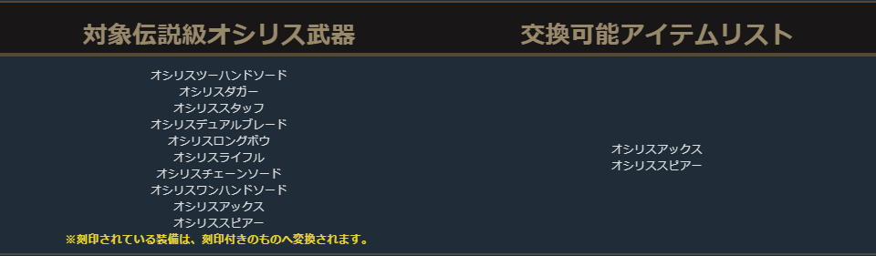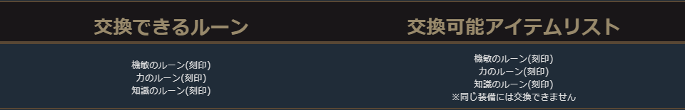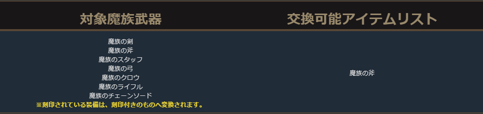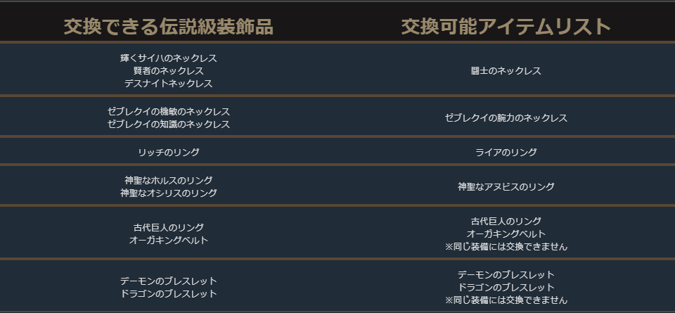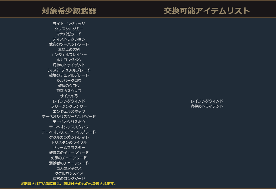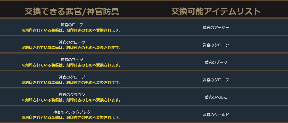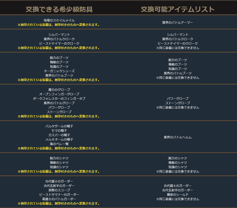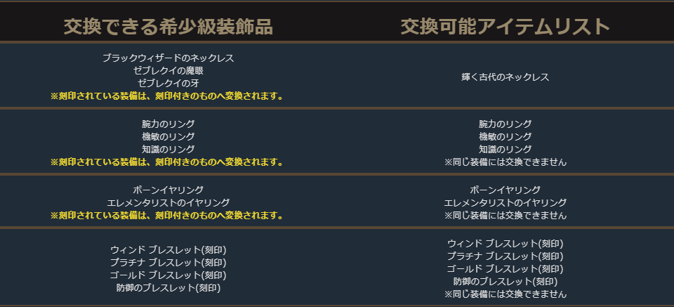 クラスチェンジを行う際に交換可能なアイテムは、下記の希少級以上のクラスチェンジ前のキャラクターが装備可能なアイテムが対象となります。