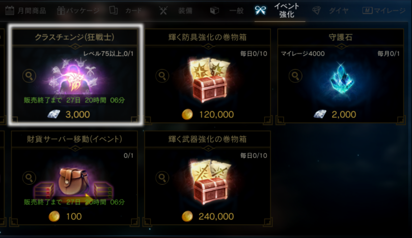 クラスチェンジとは、商品を購入したキャラクターの職業を、キャラクター名と経験値を維持したまま「狂戦士へ変更」するサービスです。