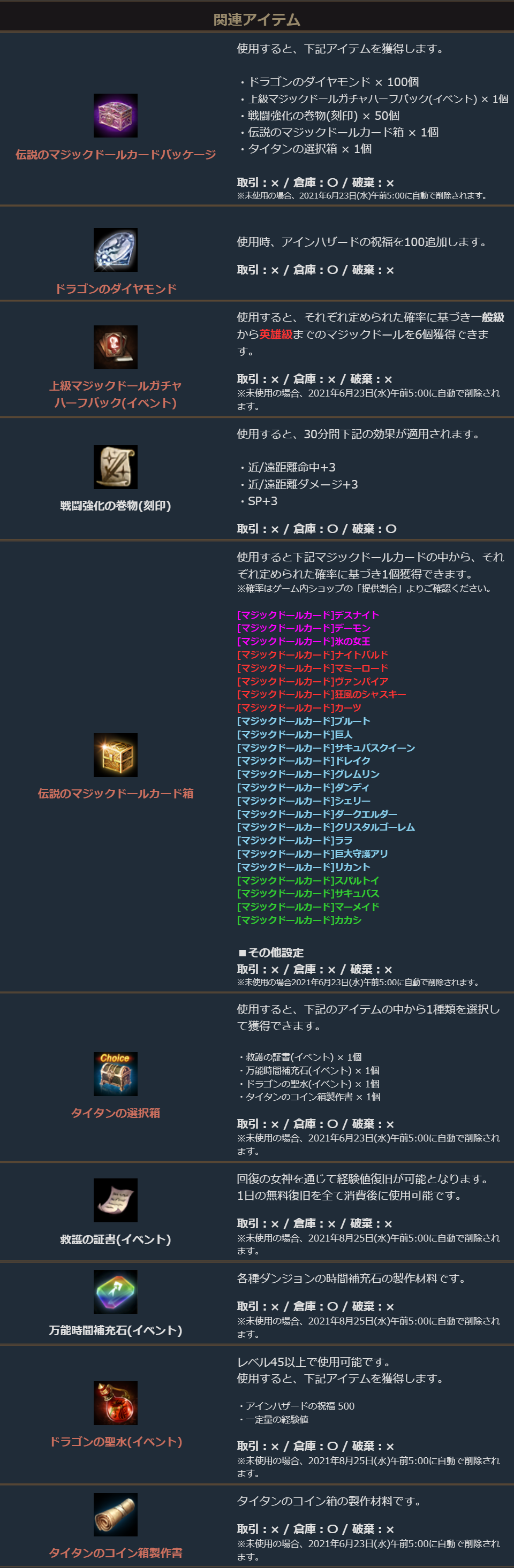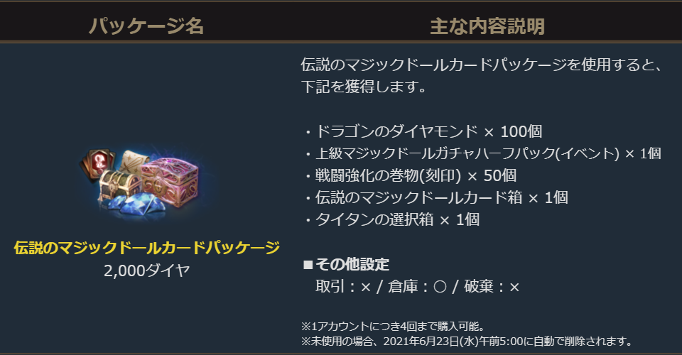 2021年6月2日より、ゲーム内ショップで「EP.4 TITANアップデート記念伝説のマジックドールカードパッケージ」の販売を開始しました。