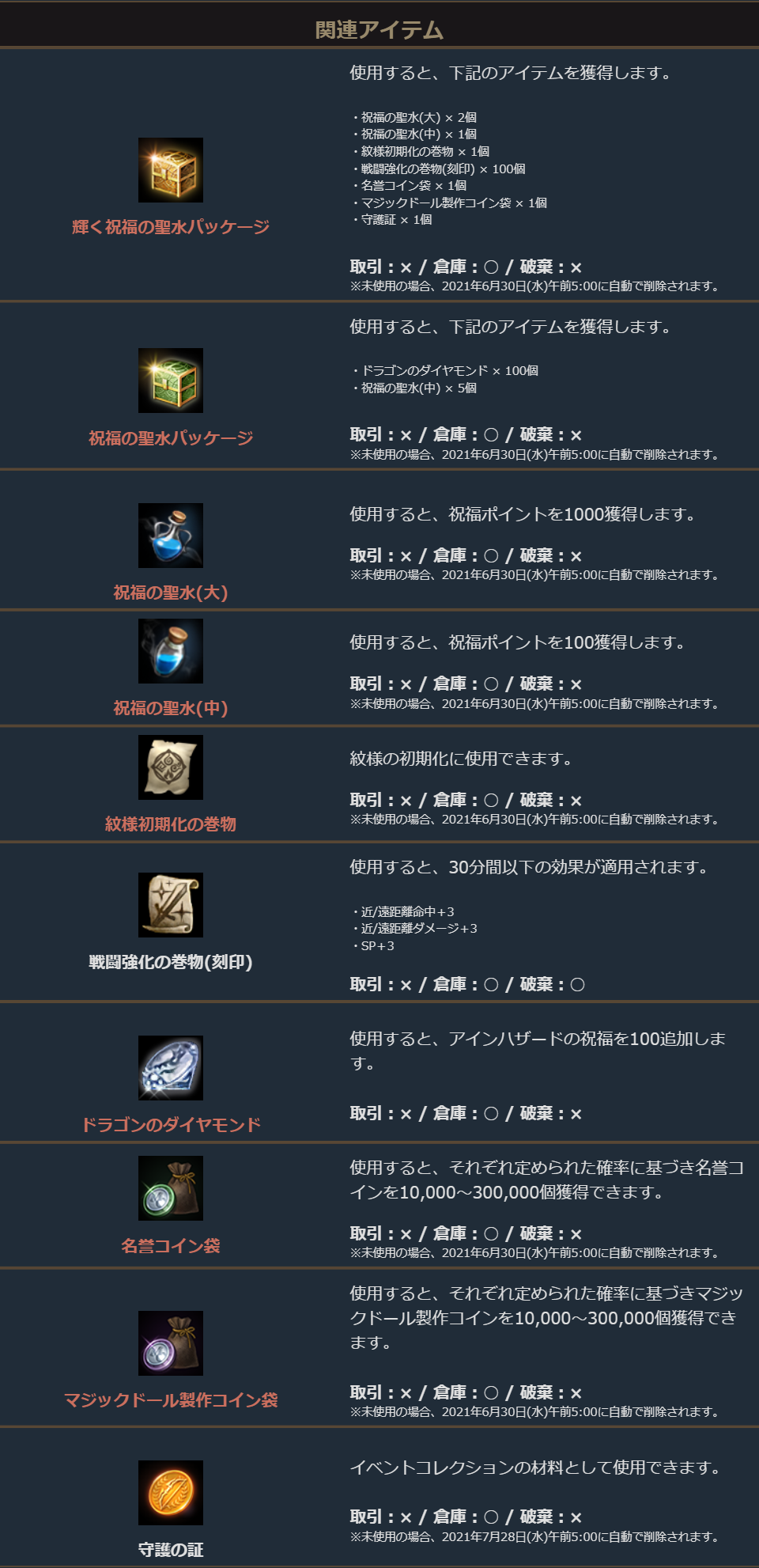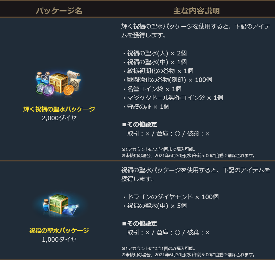 2021年6月9日より、ゲーム内ショップで「祝福の聖水パッケージ」の販売を開始しました。