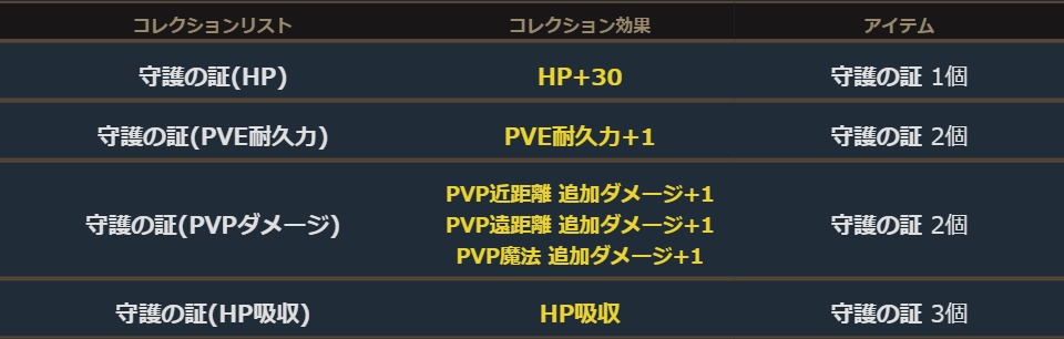 「守護の証」を材料として、イベント期間限定のコレクション効果を入手することができます。