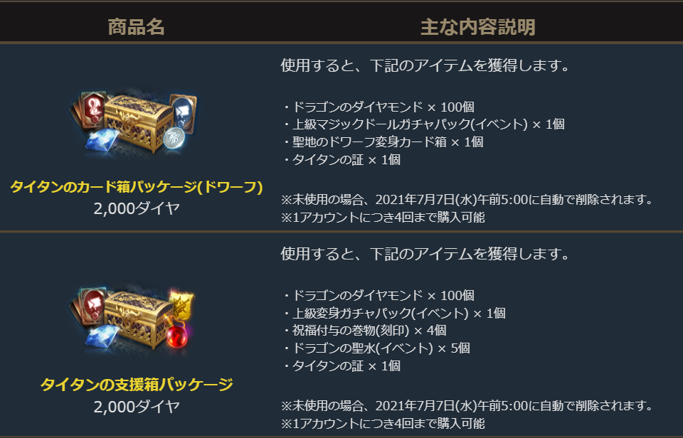 2021年6月16日より、ゲーム内ショップで「タイタンのパッケージ」の販売を開始しました。