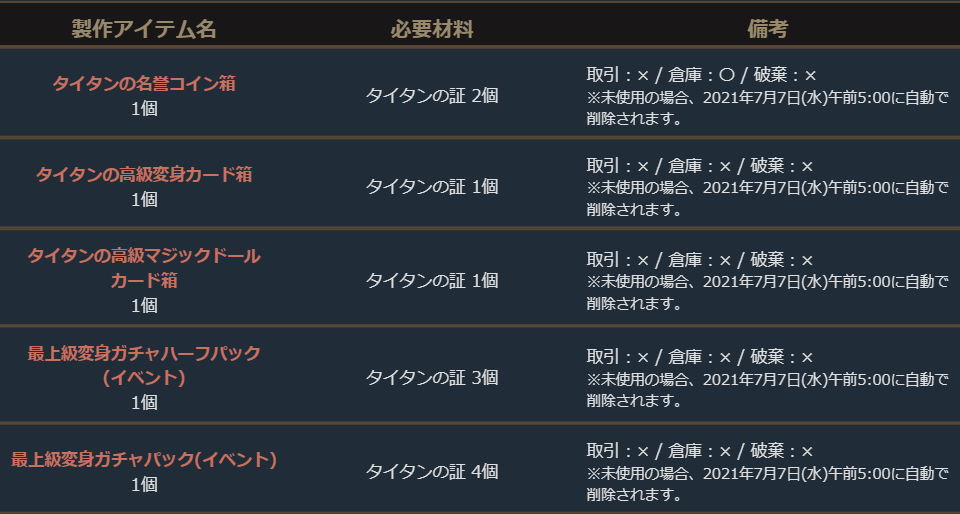 「タイタンの証」を製作材料として、イベント期間限定の製作を行うことができます。