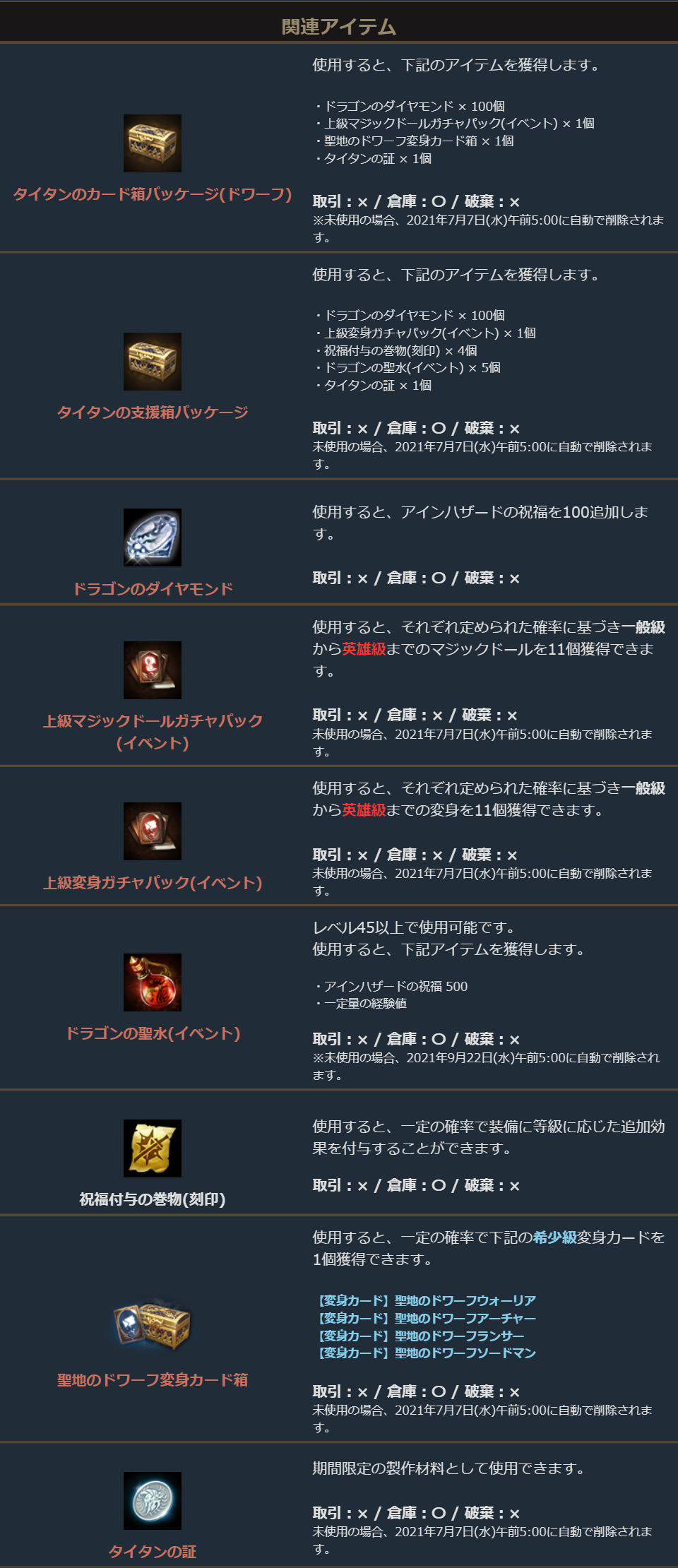 ※一部アイテムは未使用の場合、一定期間が経過すると自動で削除されます。詳しくは各アイテムの詳細をご確認ください。
