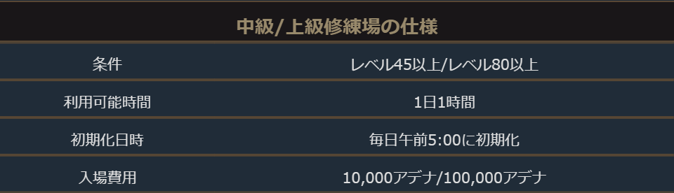 中級と上級の修練場は利用時間を共有しないため、レベル80以上のキャラクターは1日にそれぞれの修練場を最大1時間ずつ利用できます。