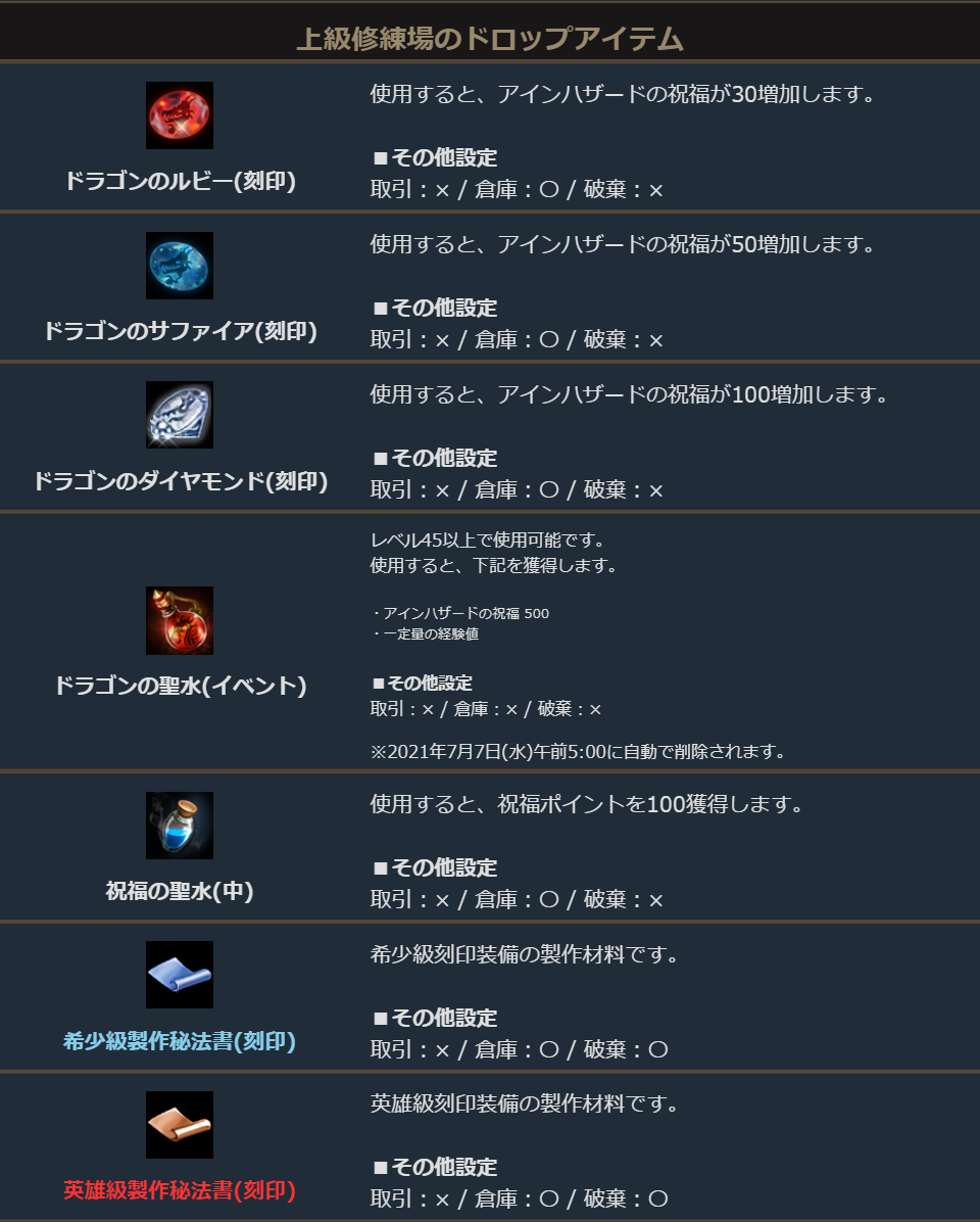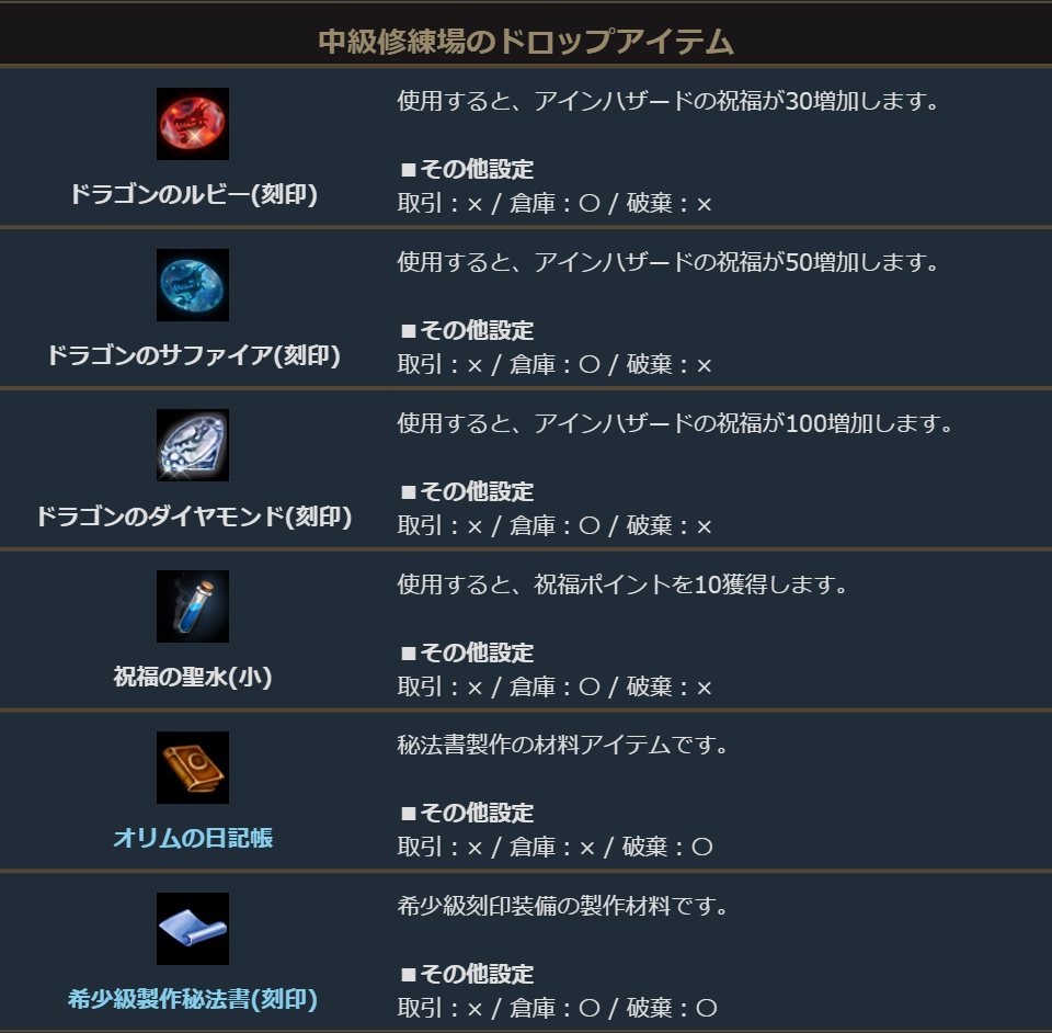 イベントダンジョンでは多量の経験値が獲得できるほか、アインハザードの祝福増加アイテムや希少・英雄級製作秘法書が獲得できます。