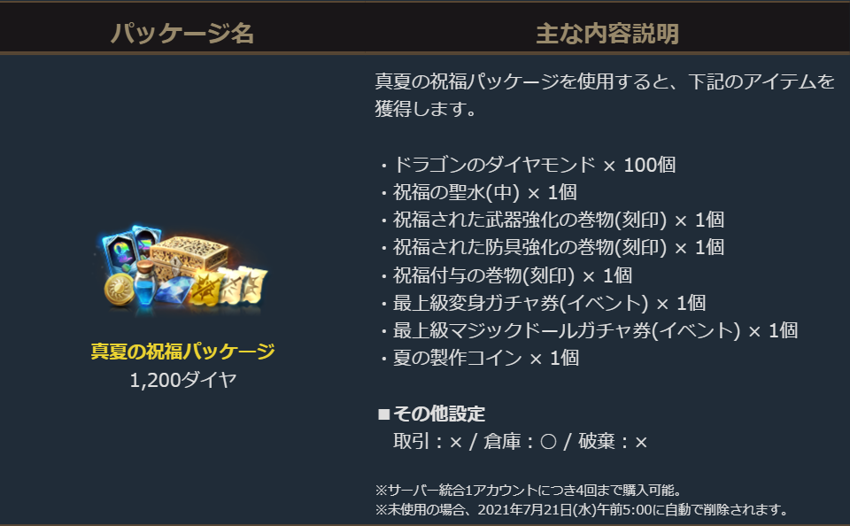 2021年6月30日より、ゲーム内ショップで「真夏の祝福パッケージ」の販売を開始しました。