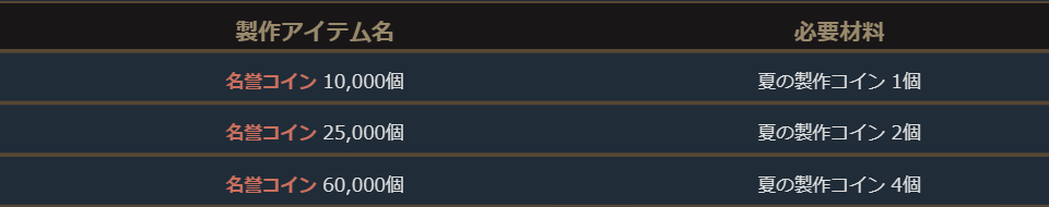 期間中、「夏の製作コイン」を材料として名誉コインを製作・入手することができます。