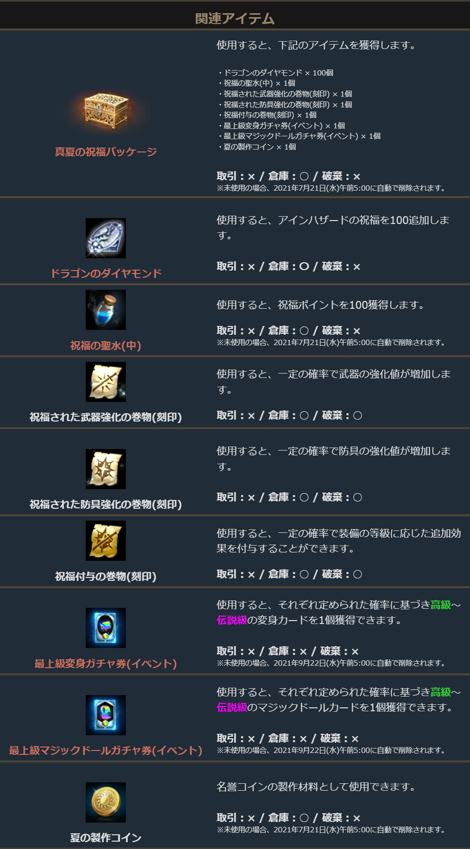 「祝福の聖水」や「祝福付与の巻物」といった貴重なアイテムに加え、名誉コイン製作できる「夏の製作コイン」が手に入る便利なパッケージです。