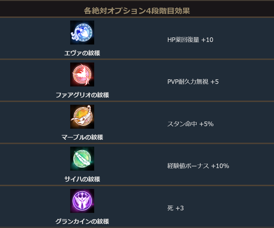 エヴァ、ファアグリオ、マーブル、サイハ、グランカインの紋様に、4段階目の絶対オプションを追加しました。