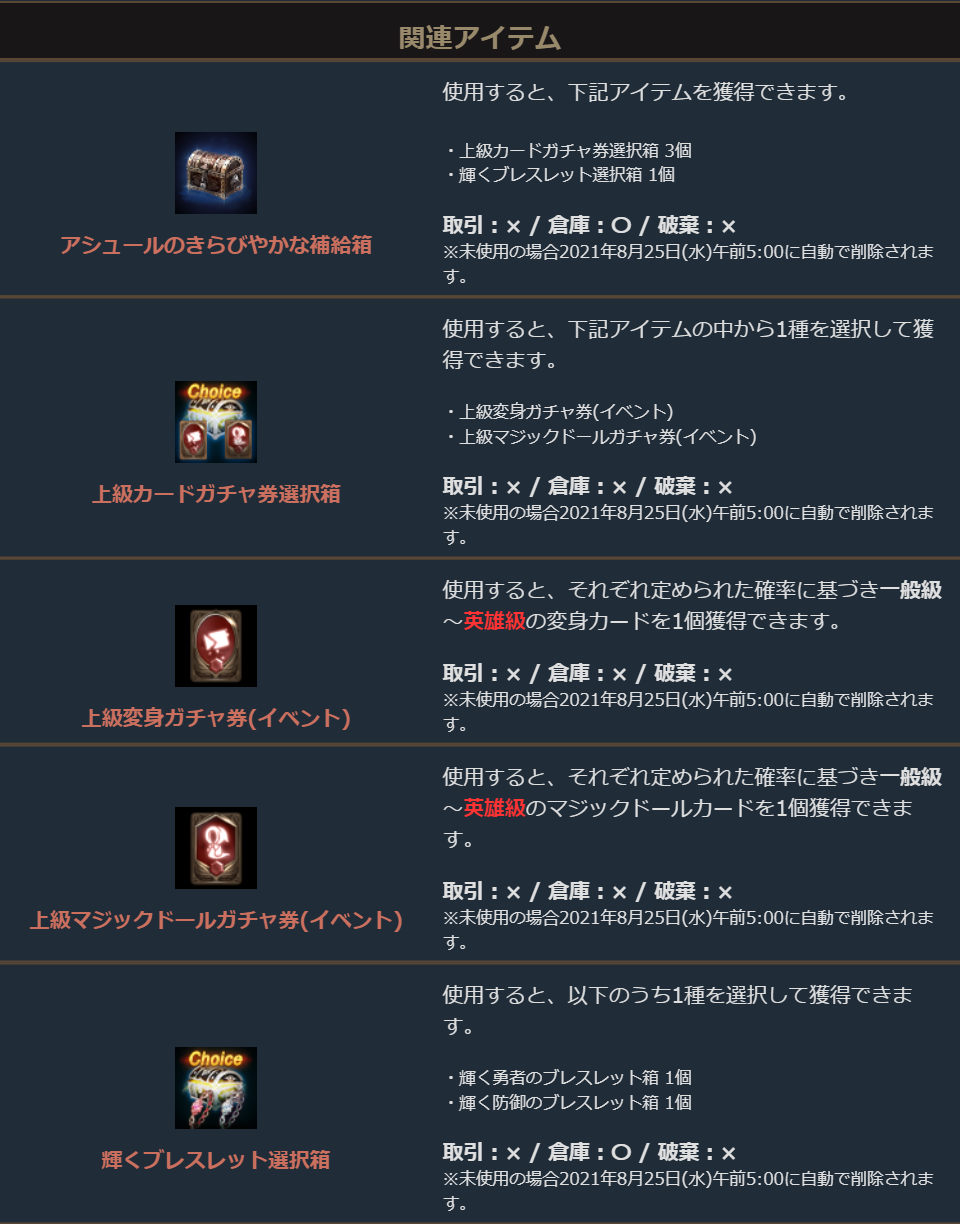 ※一部アイテムは未使用の場合、一定期間が経過すると自動で削除されます。詳しくは各アイテムの詳細をご確認ください。