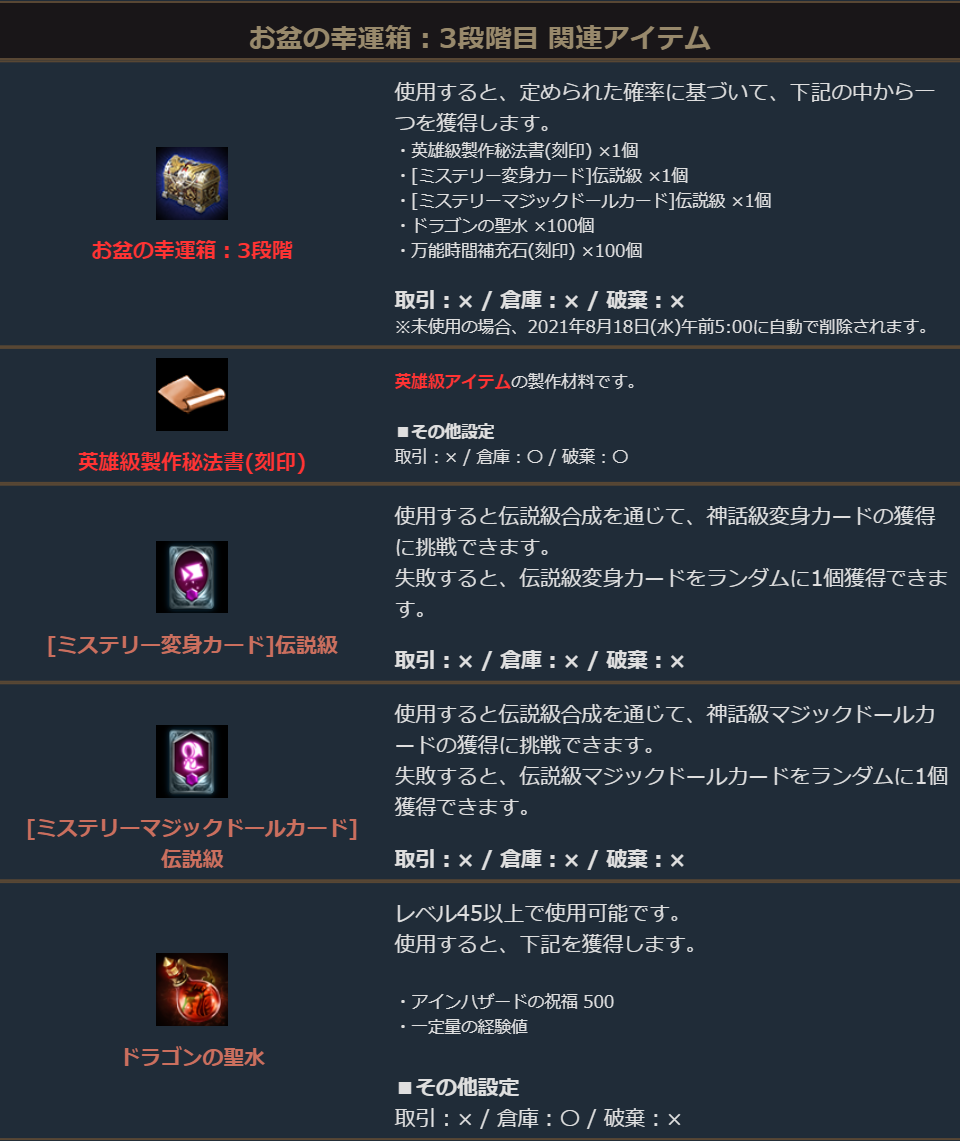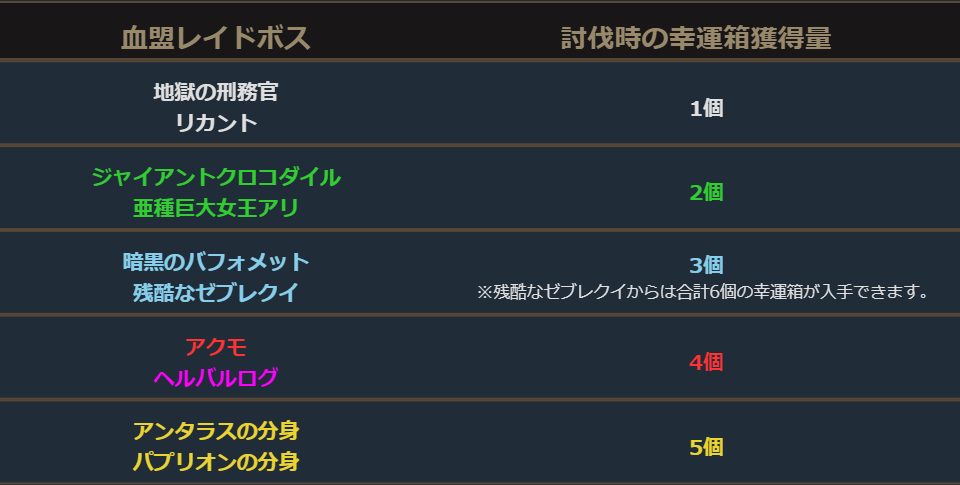 イベント期間中、血盟レイドボスを討伐すると、討伐に参加したキャラクターは「お盆の幸運箱」を獲得できます。