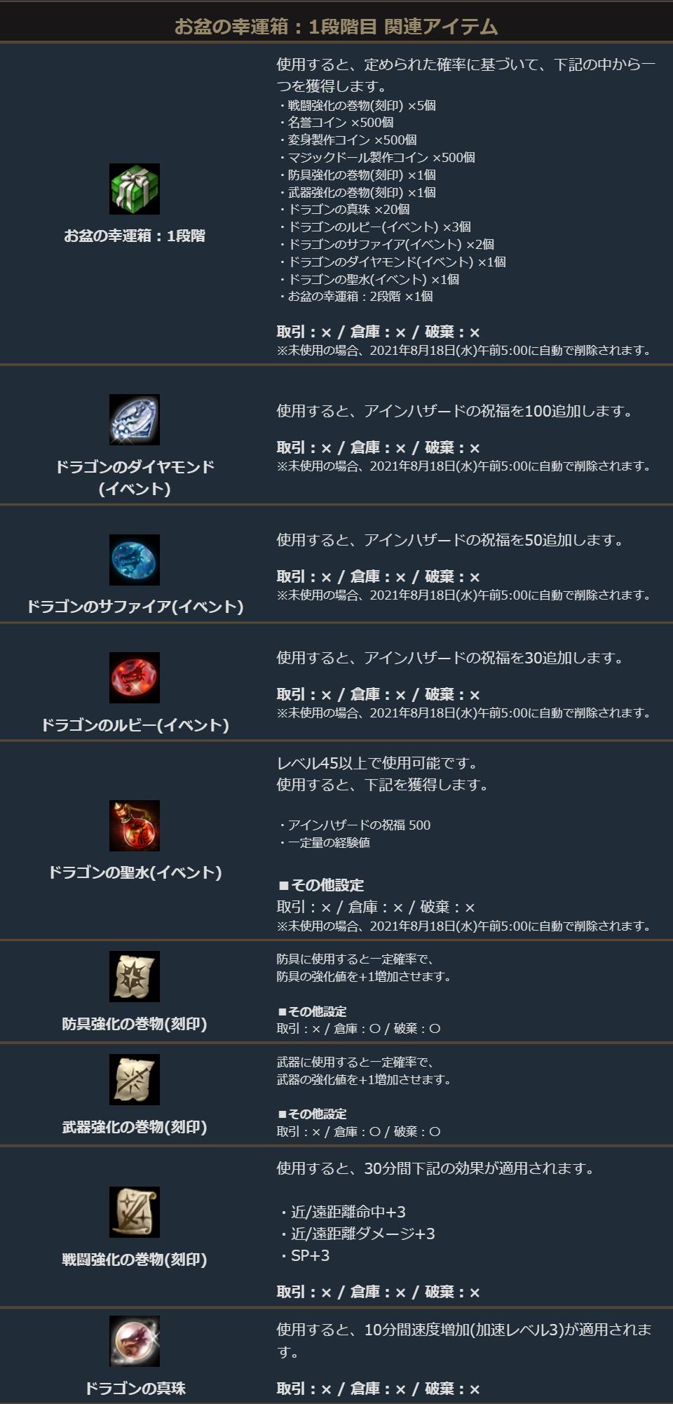 「お盆の幸運箱」からはドラゴンのダイヤモンドなどの各種アイテムを入手できます。