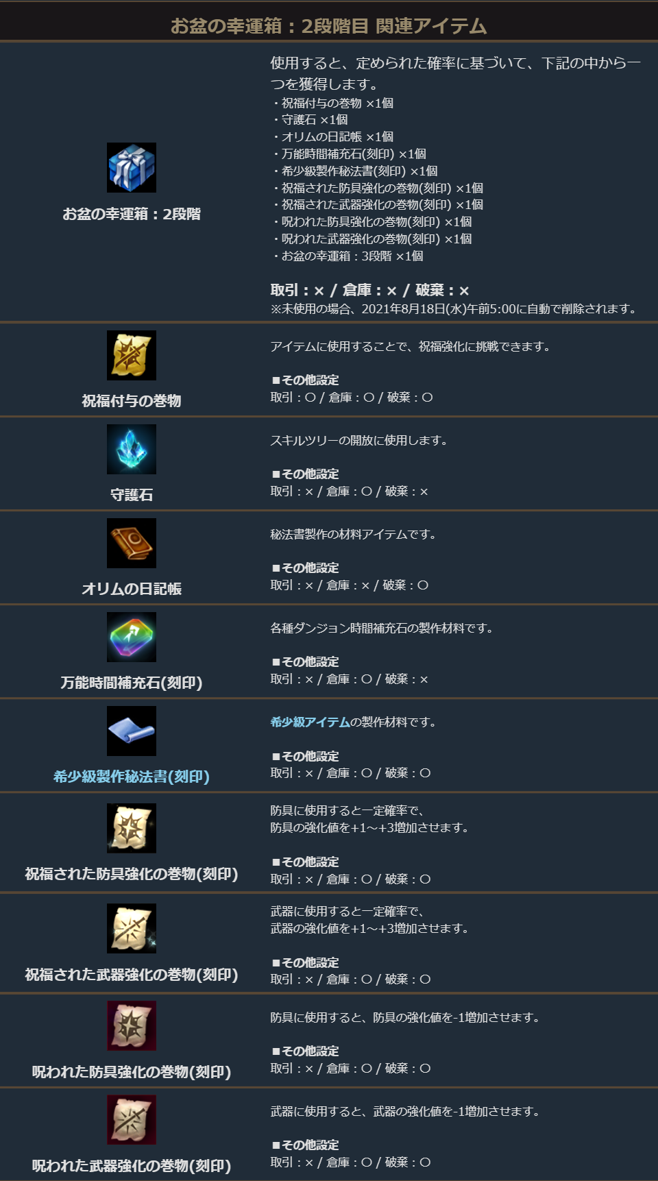 こうして入手した「お盆の幸運箱」からは、元の「お盆の幸運箱」よりも希少なアイテムが獲得できます。