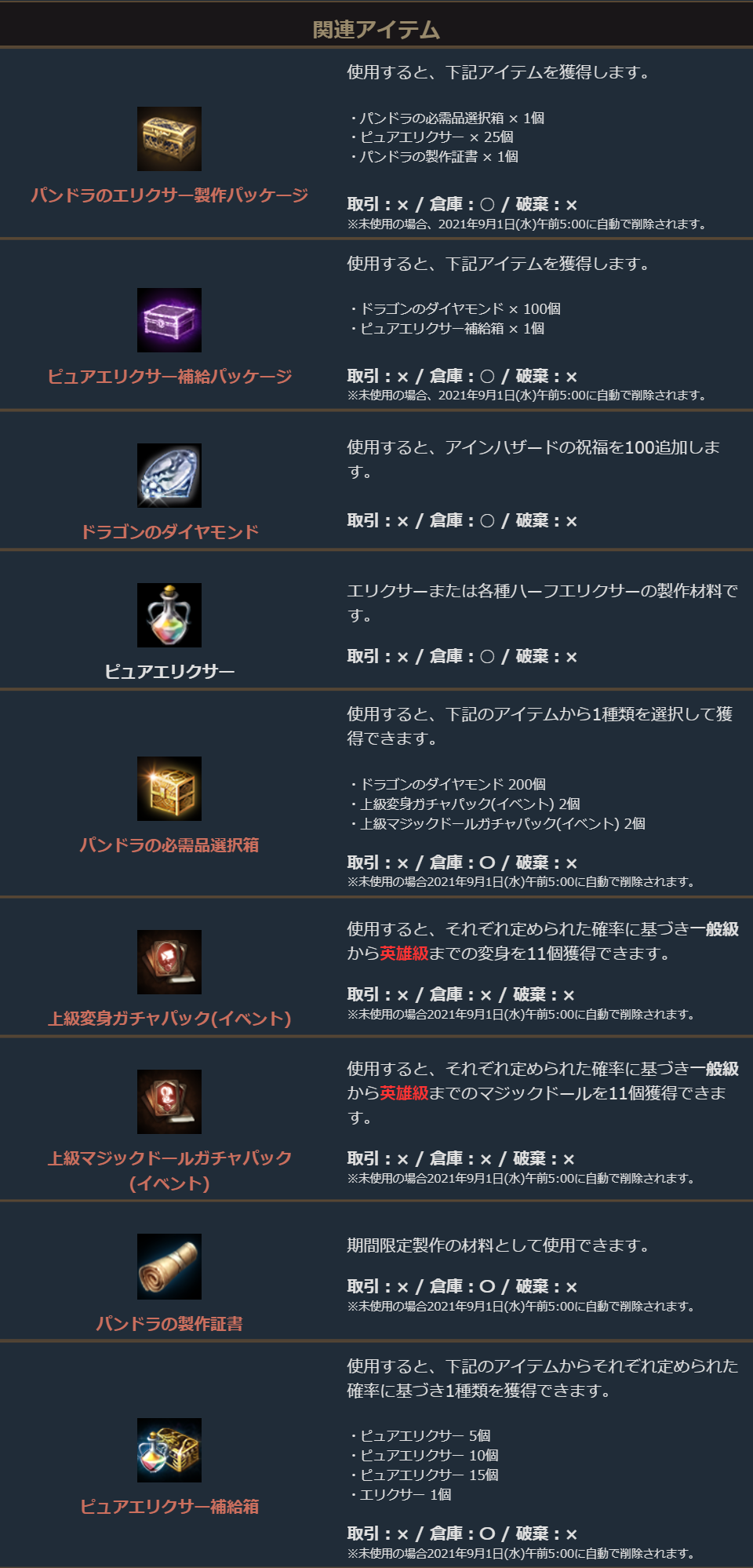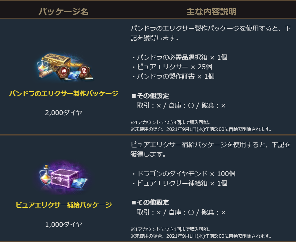 2021年8月18日より、ゲーム内ショップで「パンドラのエリクサー製作パッケージ」の販売を開始しました。