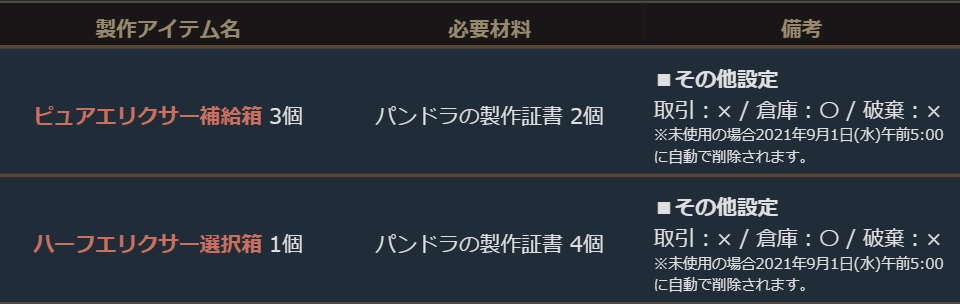 期間中、「パンドラの製作証書」を製作材料として下記の製作を行うことができます。