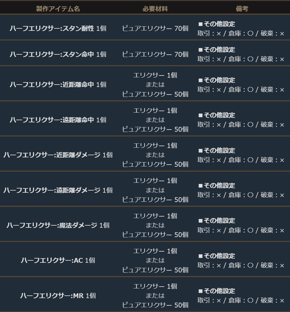 ピュアエリクサーまたはエリクサーを材料として、ハーフエリクサーの製作を行うことができます。