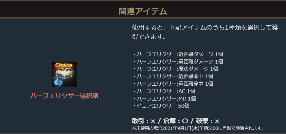 ※一部アイテムは未使用の場合、一定期間が経過すると自動で削除されます。詳しくは各アイテムの詳細をご確認ください。