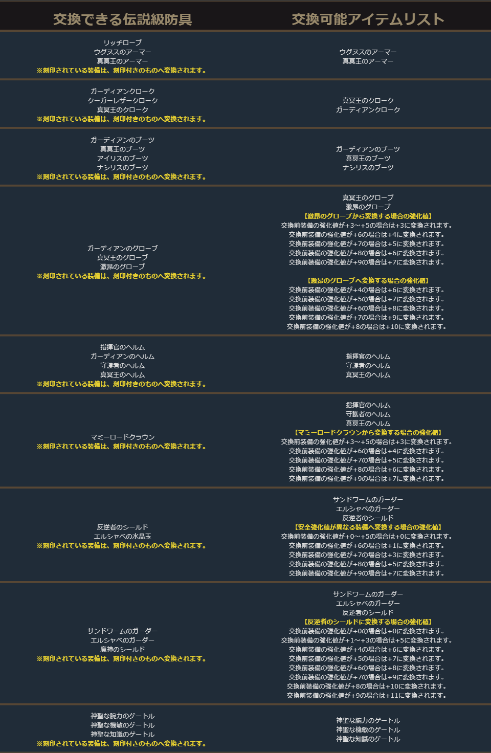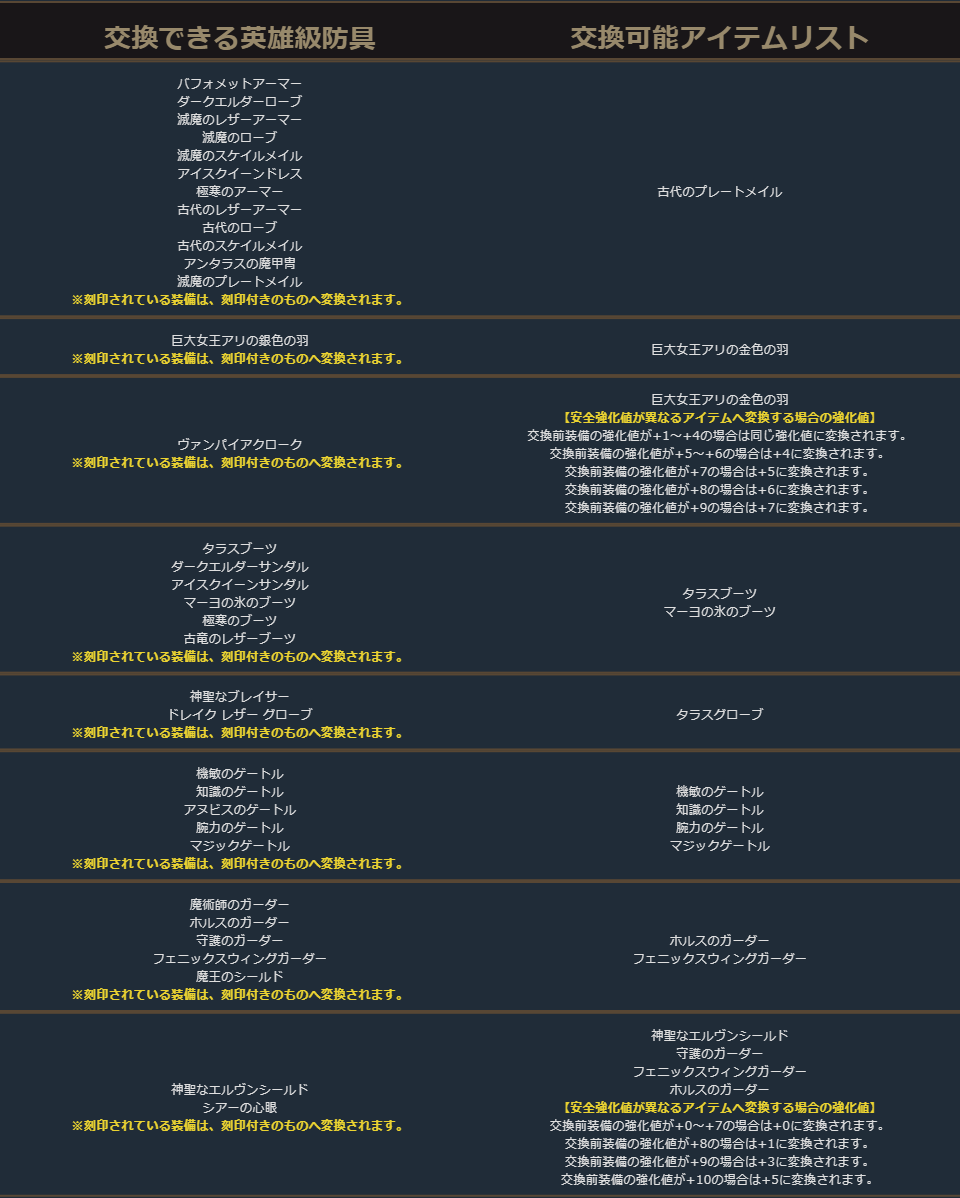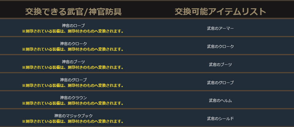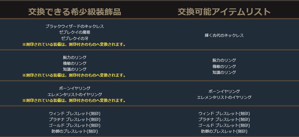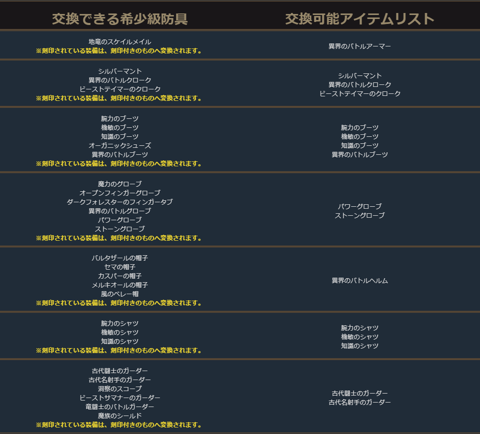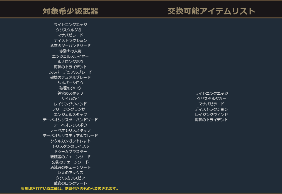 クラスチェンジを行う際に交換可能なアイテムは、下記の希少級以上のクラスチェンジ前のキャラクターが装備可能なアイテムが対象となります。