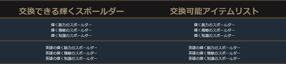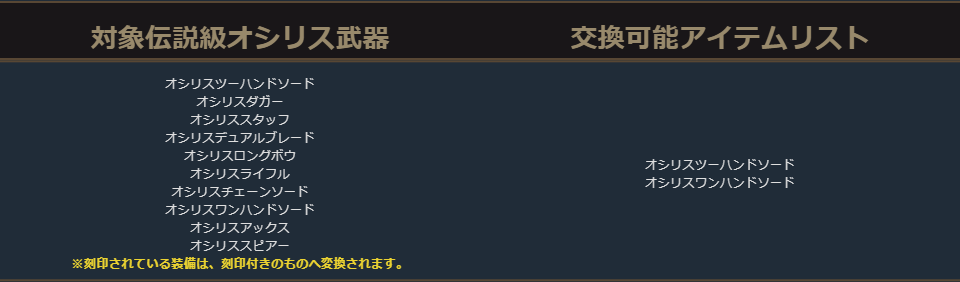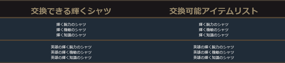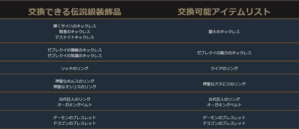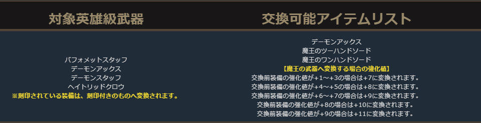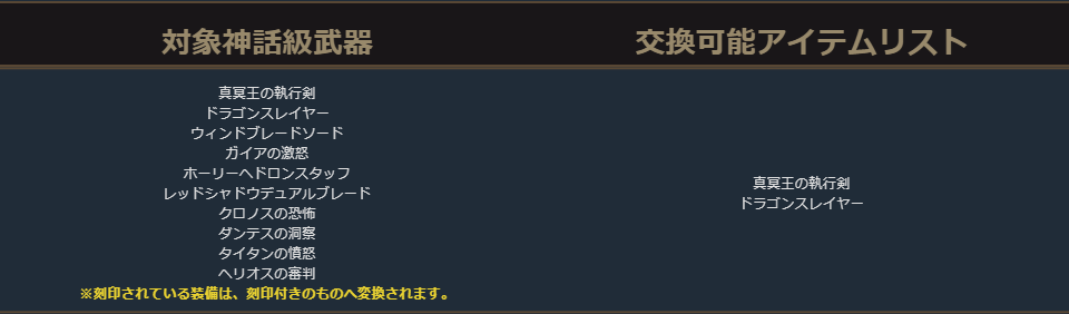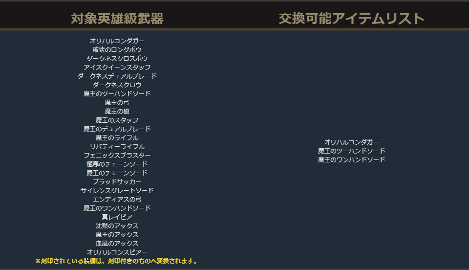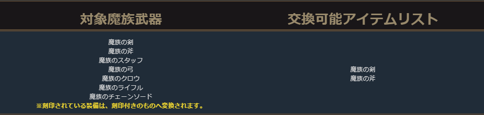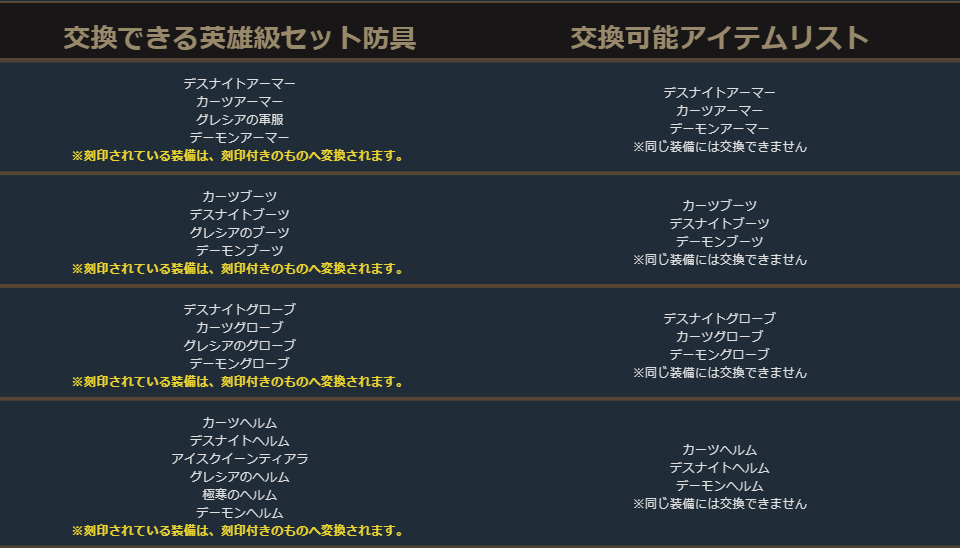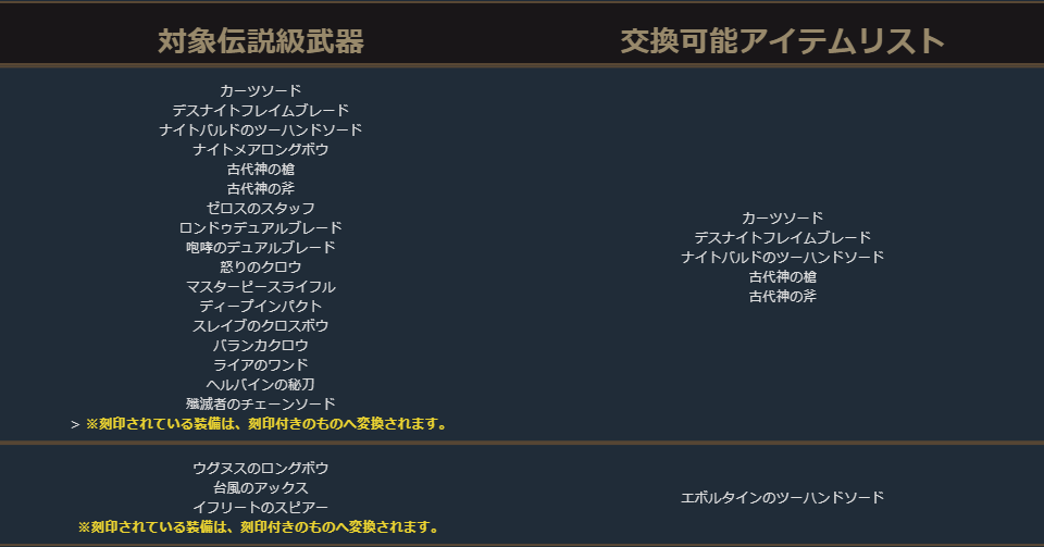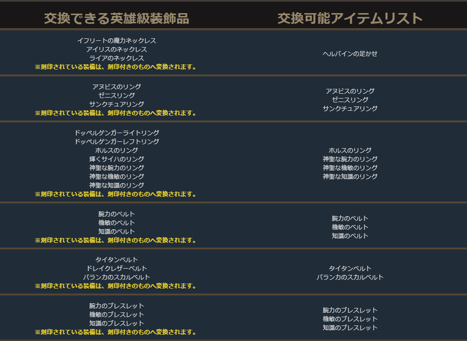 クラスチェンジを行う際に交換可能なアイテムは、下記の希少級以上のクラスチェンジ前のキャラクターが装備可能なアイテムが対象となります。