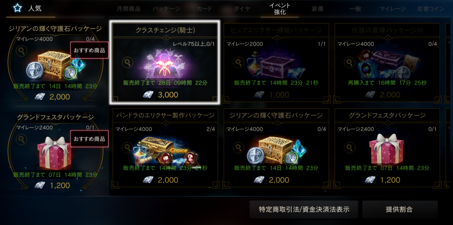 STEP.1 メニュー > ショップ > イベント強化より、「クラスチェンジ(騎士)」を選択してください。