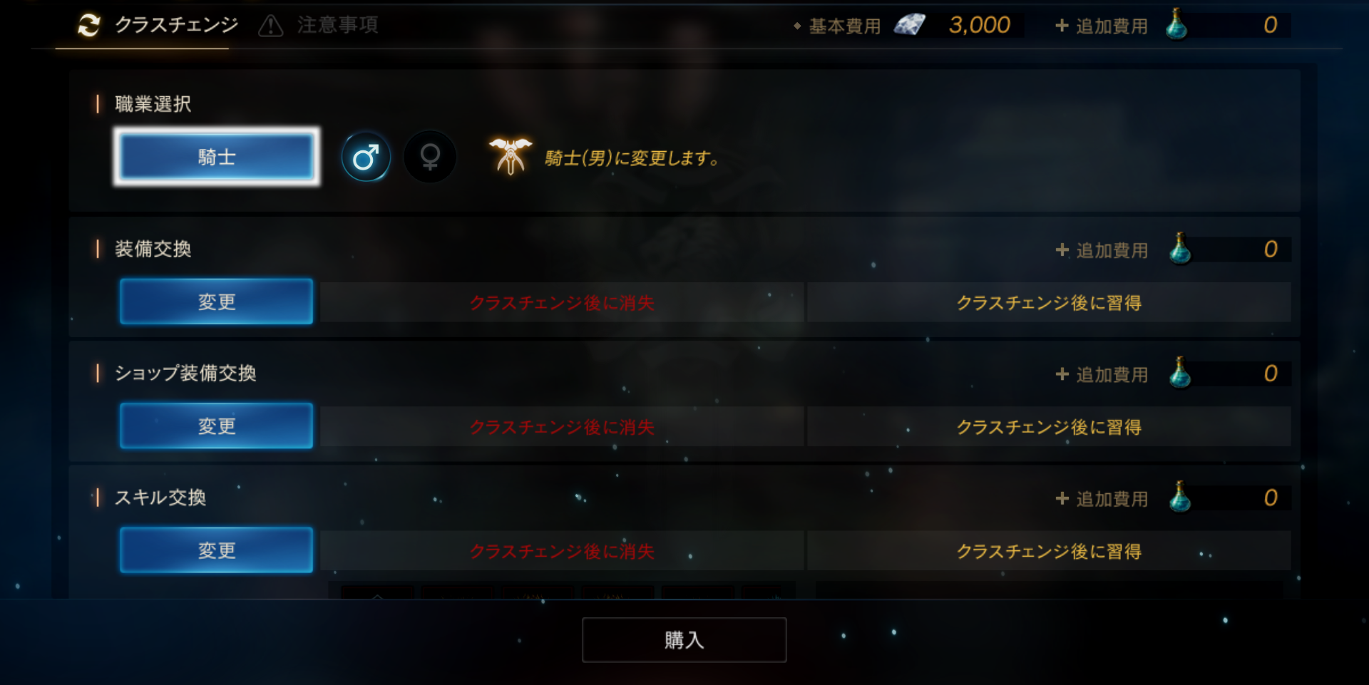 クラスチェンジとは、商品を購入したキャラクターの職業を、キャラクター名と経験値を維持したまま「騎士へ変更」するサービスです。