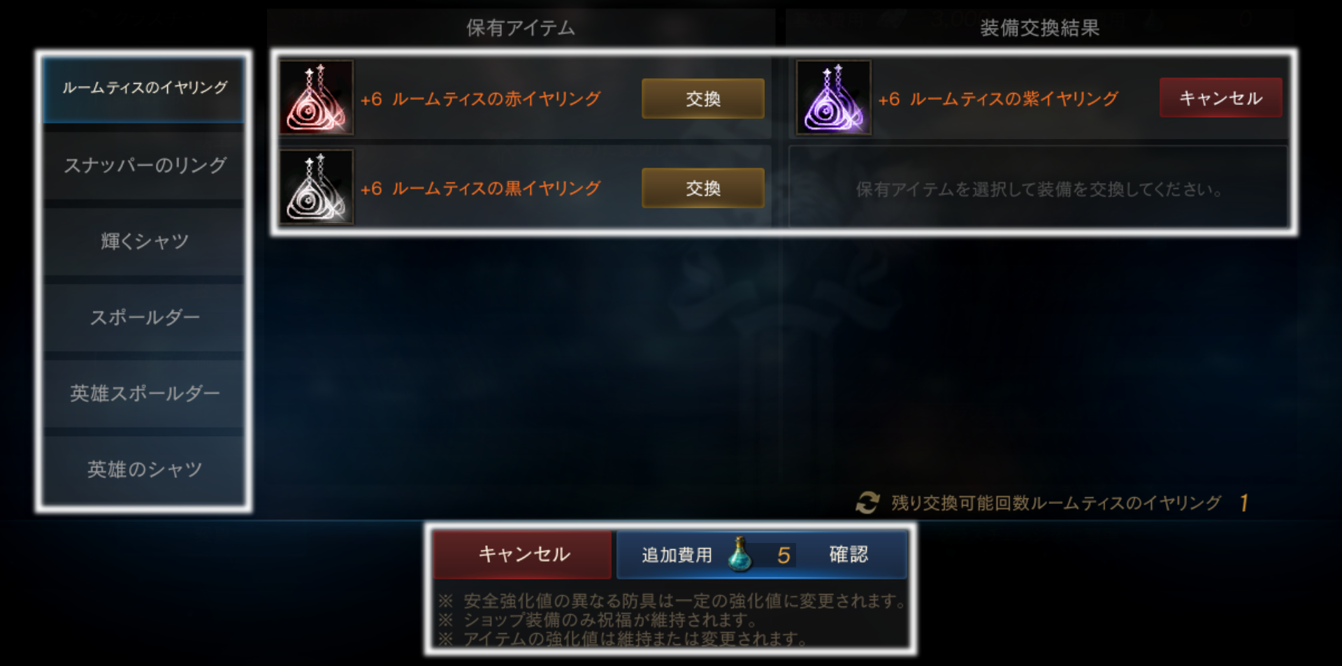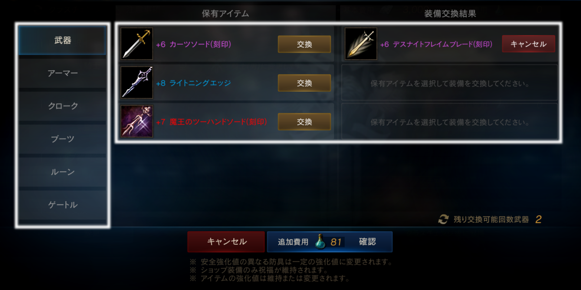 ※【ご注意】本項目で装備の交換を行わないと、後から交換することは出来ませんので必ず忘れないようお願い致します。