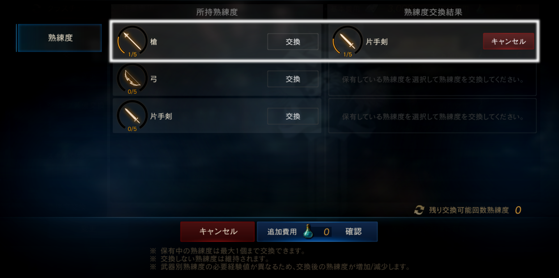 STEP.6 熟練度交換で、特定の武器熟練度を「片手剣」または「ツーハンドソード」に合算できます。