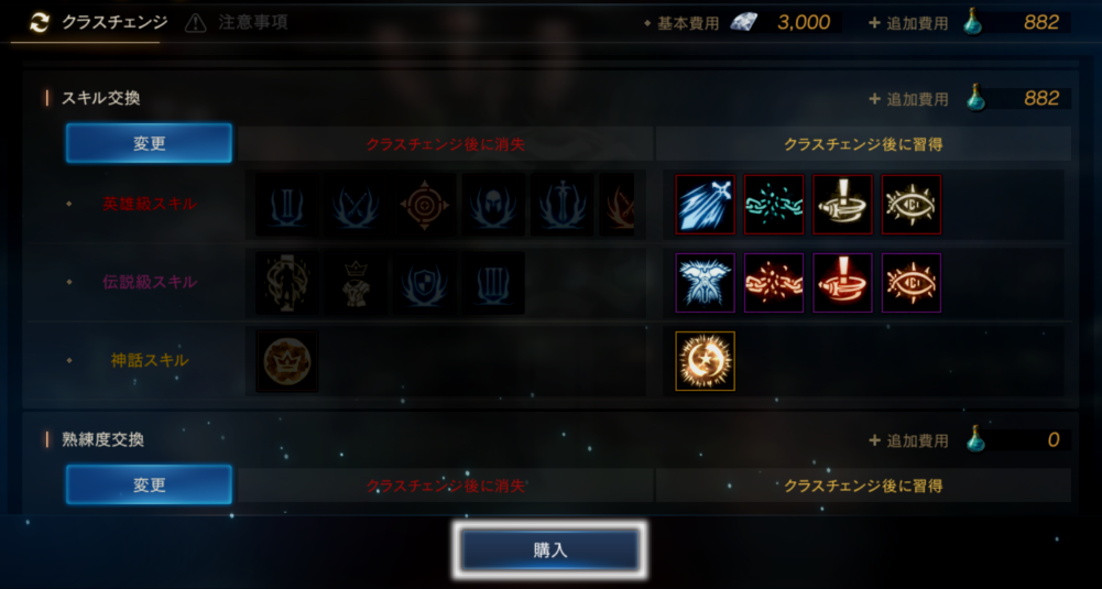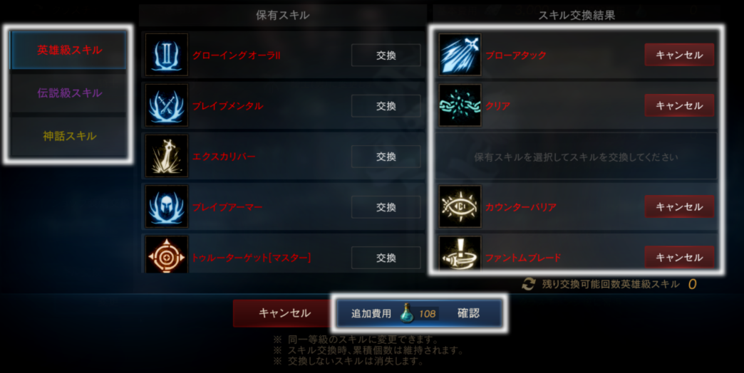 変換できるのは英雄・伝説級スキルが最大4つまで、神話級のスキルの交換は最大1つまでとなります。