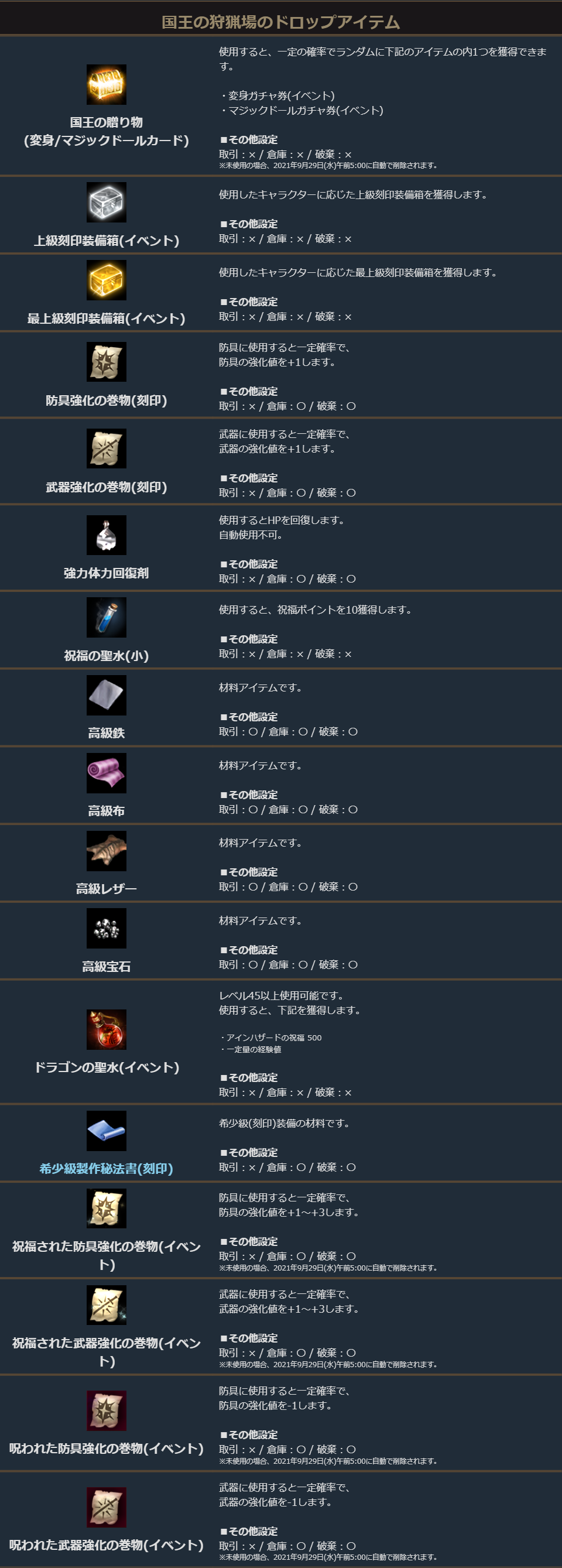 国王の狩猟場では、ドラゴンの聖水や希少級製作秘法書のほか、ガチャ券がランダムに手に入る「国王の贈り物(変身/マジックドールカード)」がドロップします。
