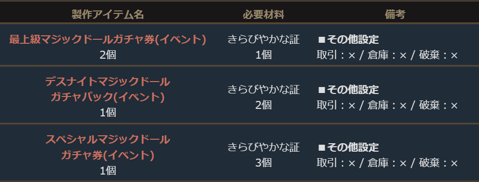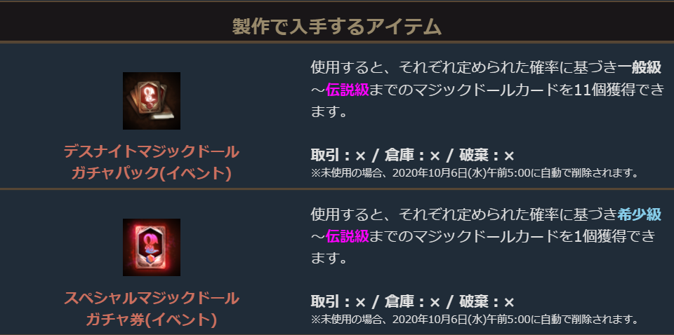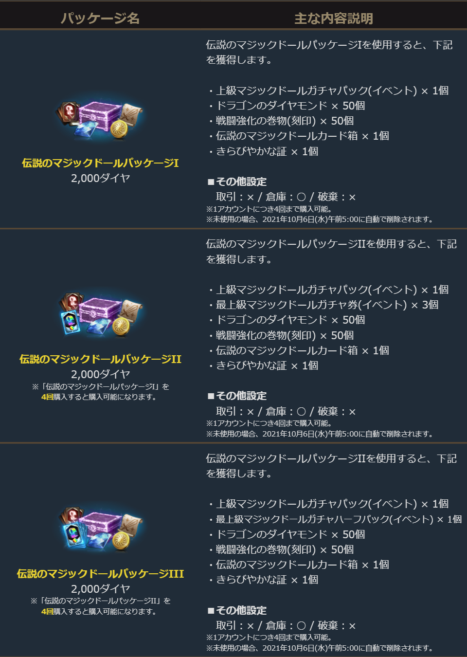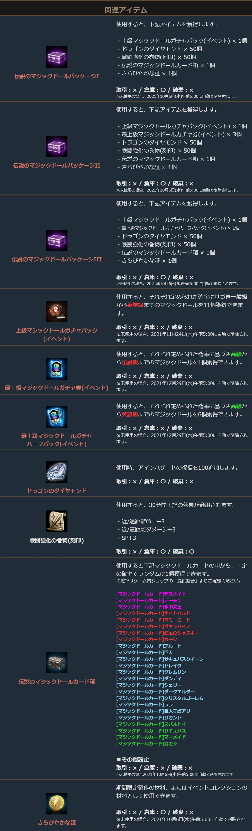 ・伝説のマジックドールパッケージII…伝説のマジックドールパッケージIを4回購入すると購入可能。