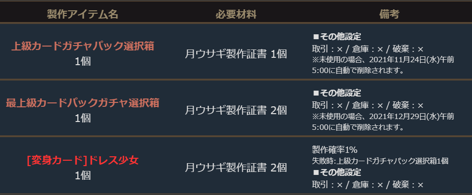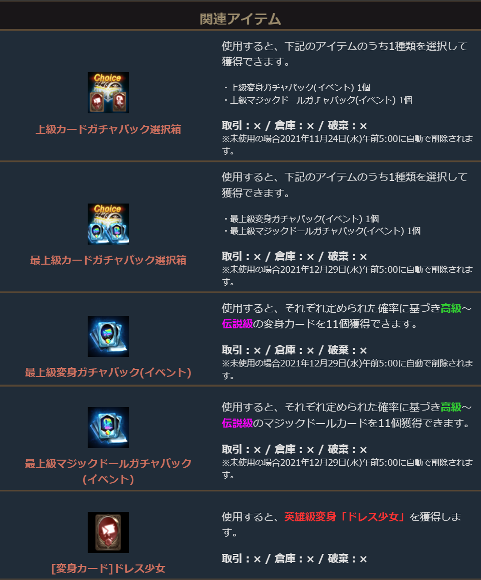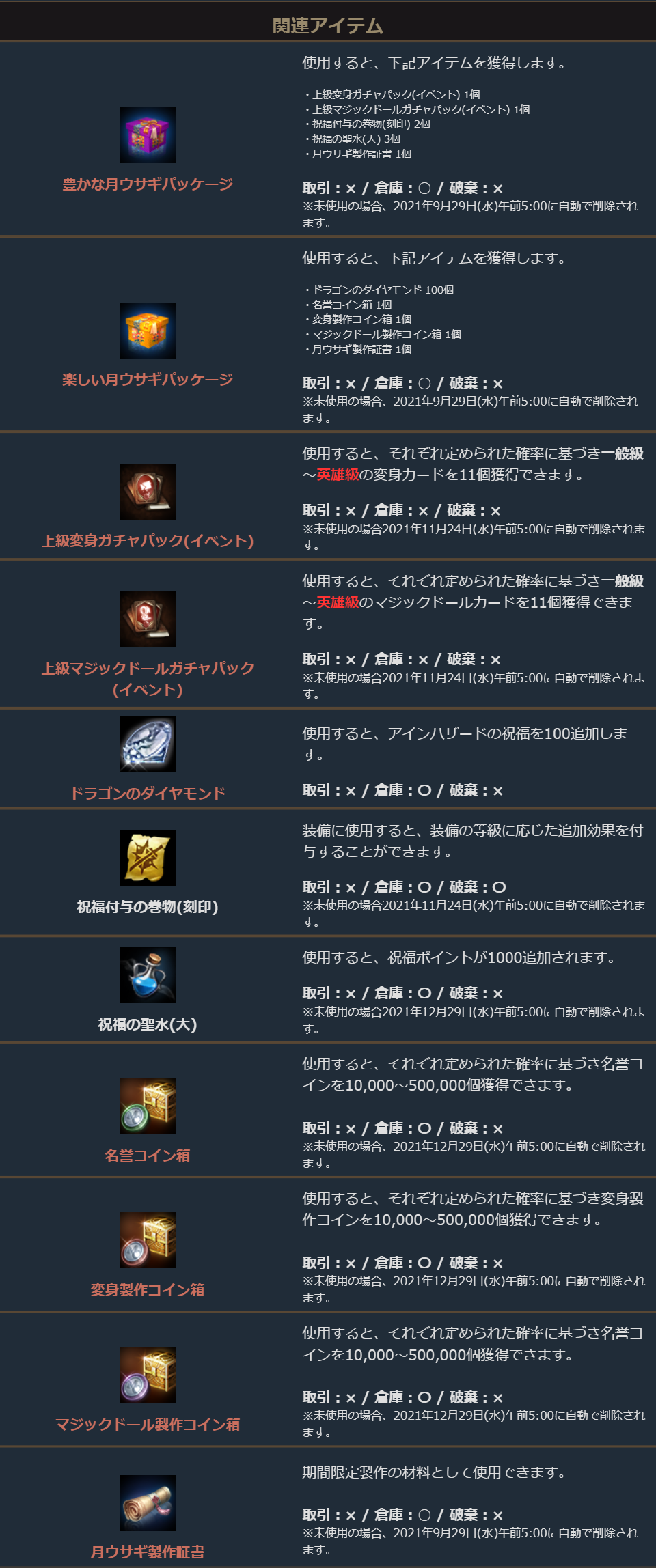 ※一部アイテムは未使用の場合、一定期間が経過すると自動で削除されます。詳しくは各アイテムの詳細をご確認ください。