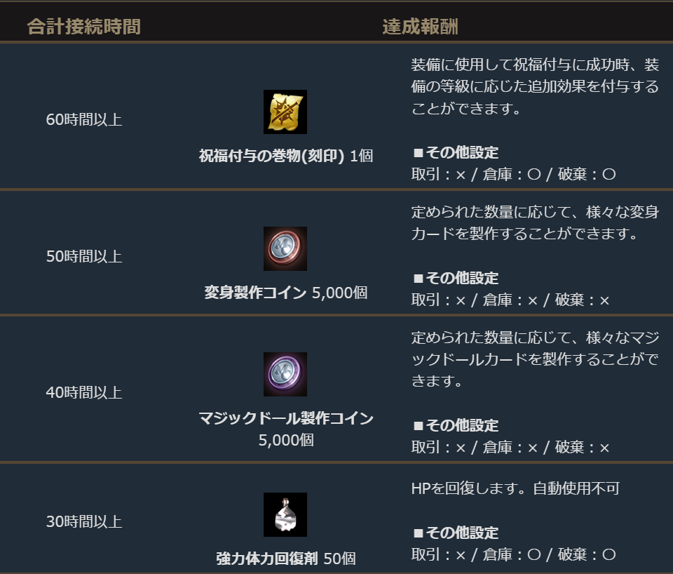 イベント期間中、アカウント内のレベル60以上のキャラクターでログインした接続時間に応じてアイテムをプレゼント!