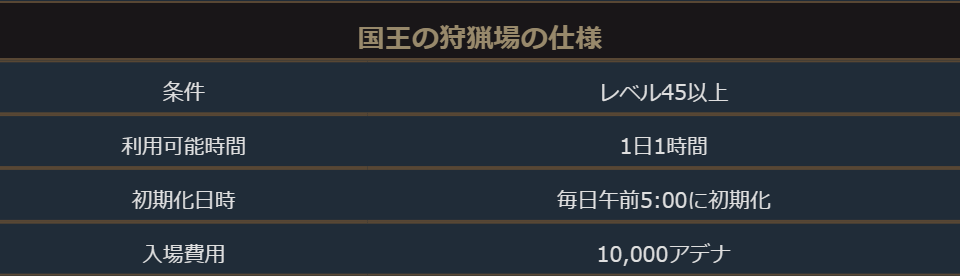 国王の狩猟場はイベント期間中、レベル45以上のキャラクターで毎日1時間利用することができます。