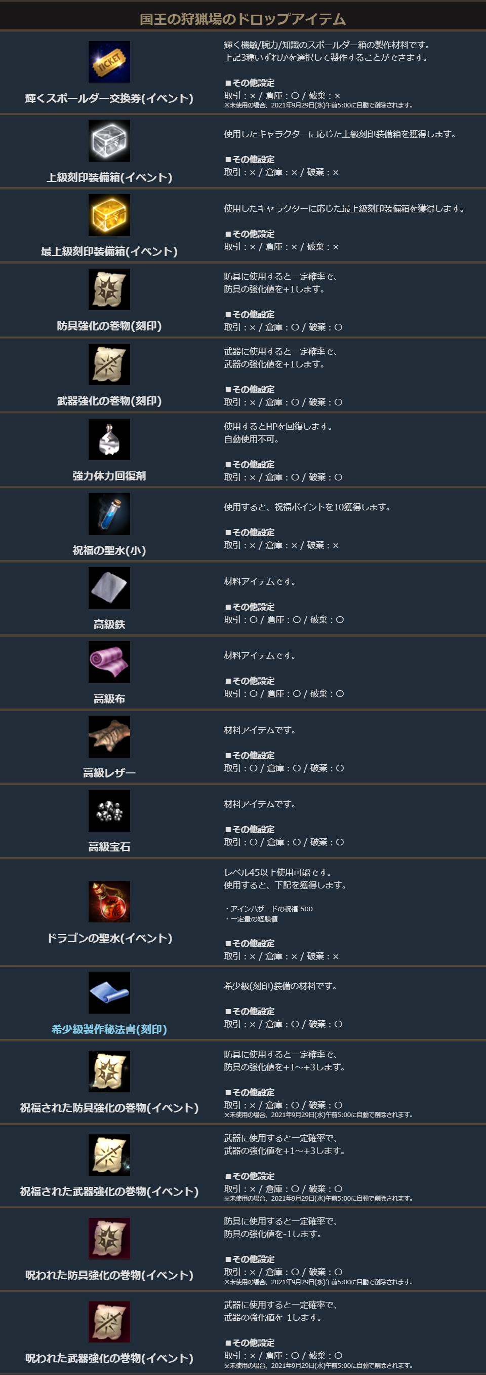 国王の狩猟場では、ドラゴンの聖水や希少級製作秘法書のほか、「輝くスポールダー交換券(イベント)」がドロップします。
